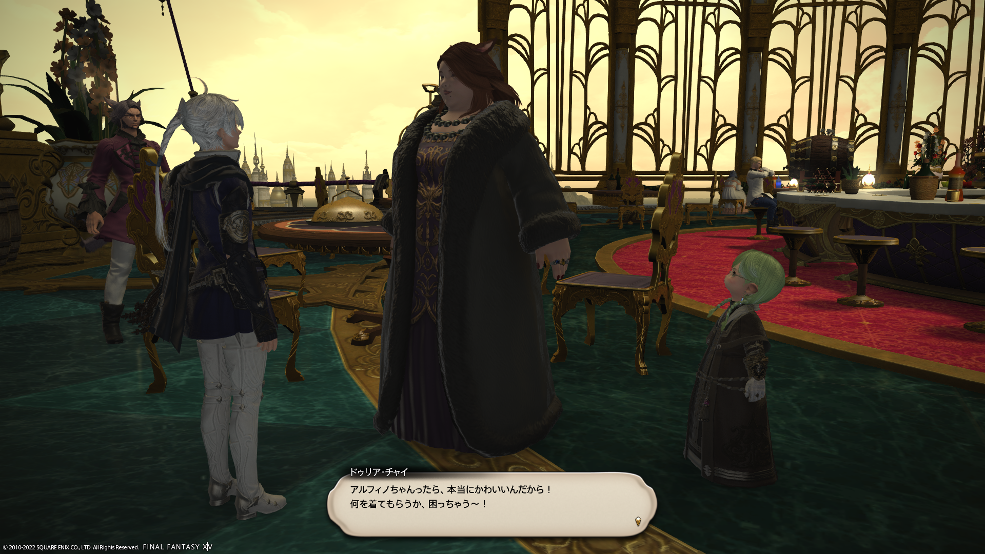 街の外の人は、上級民的な方に雇われることで、ユールモアで生活することができるそうです。マダムにそっこーで気に入られるアルフィノさん。うん、若くて容姿も整っていて品もあるし、有閑マダムにはめっちゃ受けが良さそうだよね…。