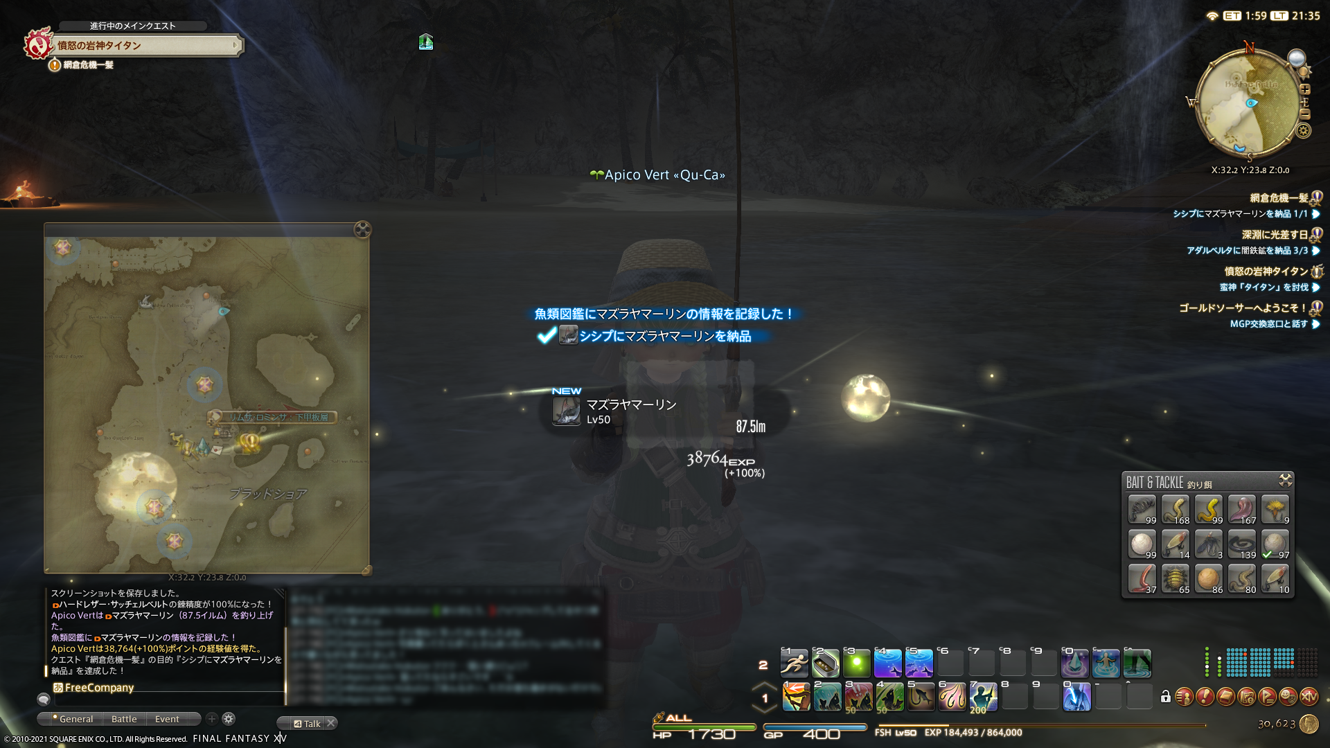 経験値が1万近く入るので、食事効果の経験値+3%アップの3%も結構なものに。依頼されたお魚を納品して釣りギルドのクエストを終えたら、次のクエストを受けられるLv50になるくらいまでは稼いでおきました。