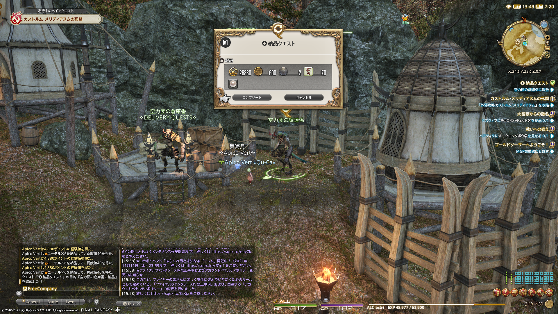 納品は楽だけど、お使いと敵と対戦するクエストはちょっと面倒ですよね。でもクラフターレベル上げできるから少しでもがんばる。