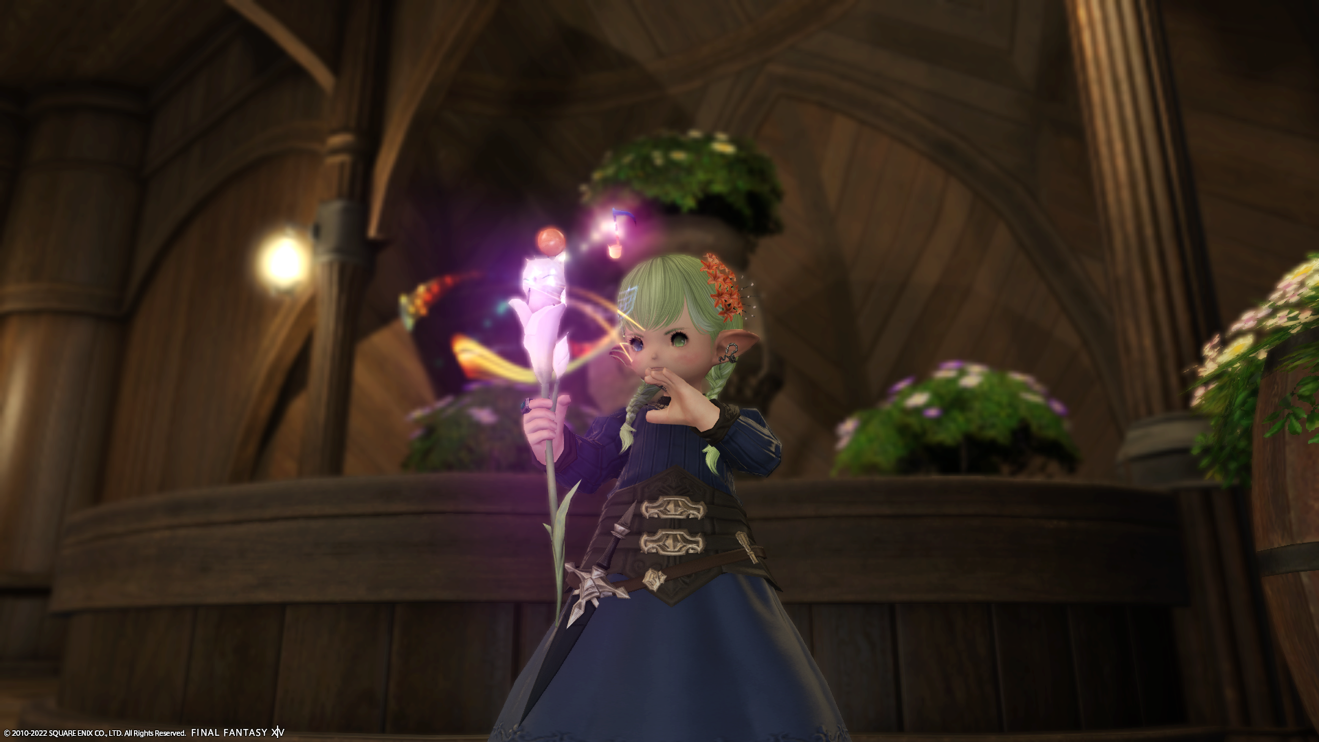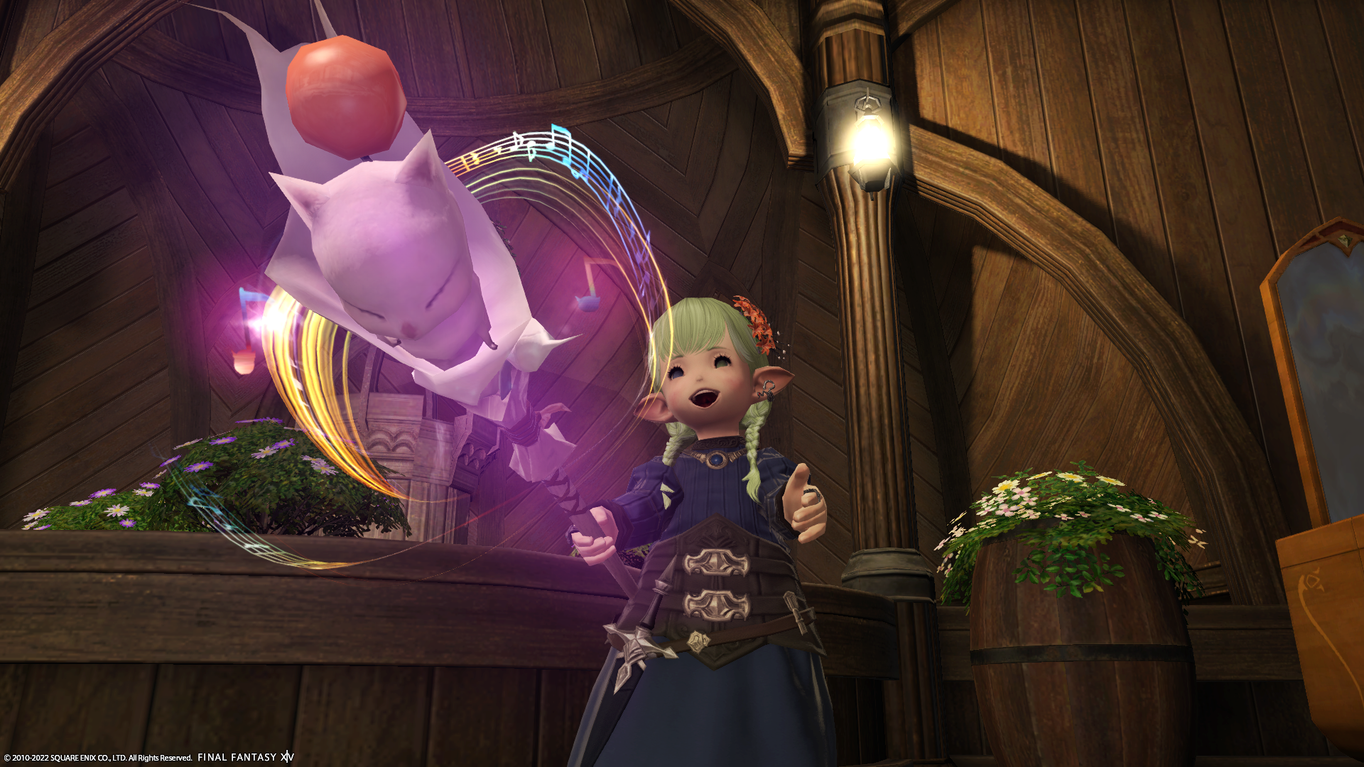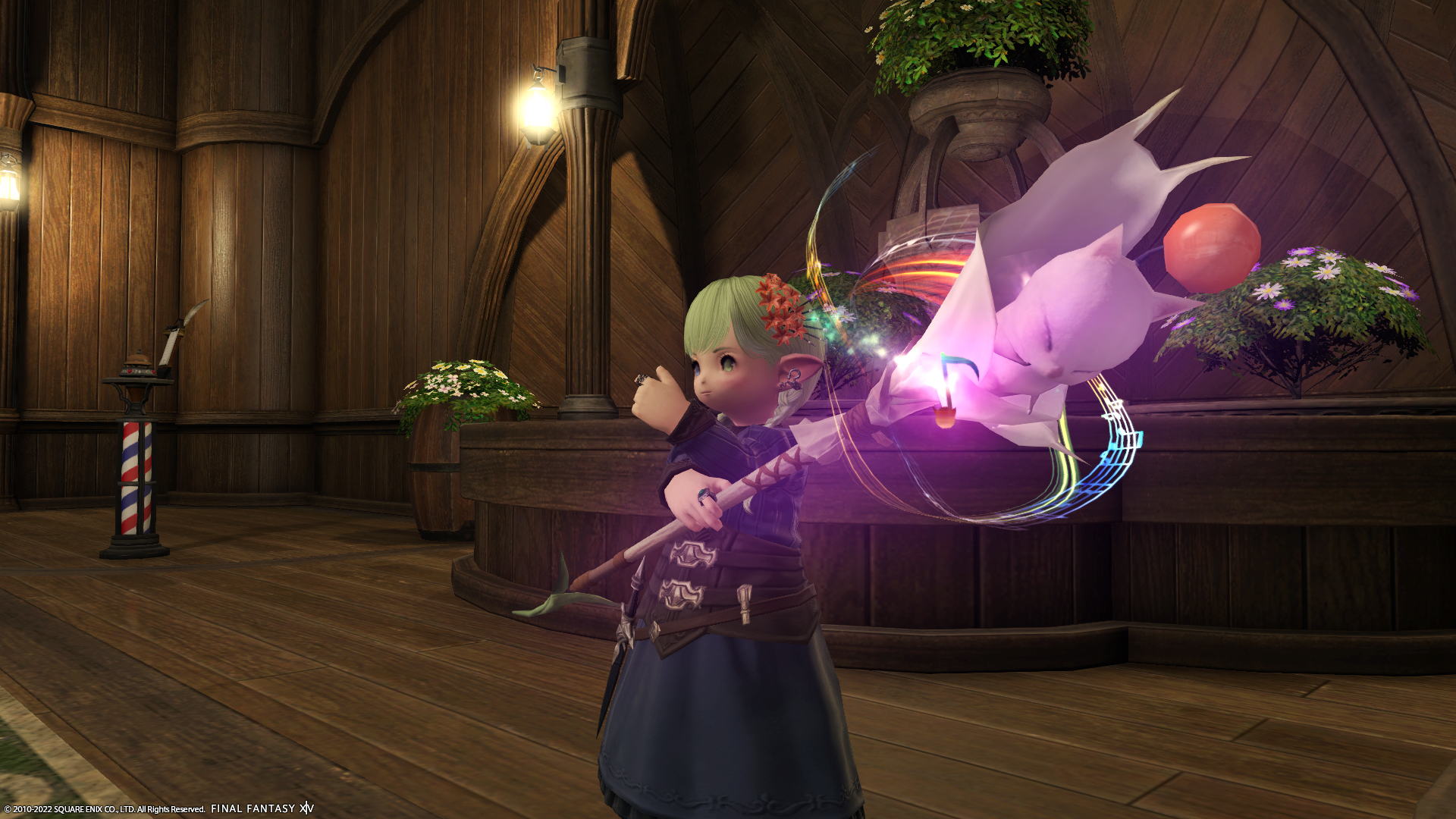 抜刀するときにきゅぽっって音がするのと、五線譜と音符の光るエフェクトがかわいい。結構前にFCメンバーさんが赤用の剣?のモーグリ武器を持っていてかわいいなーと思ってずっと欲しかったのです。