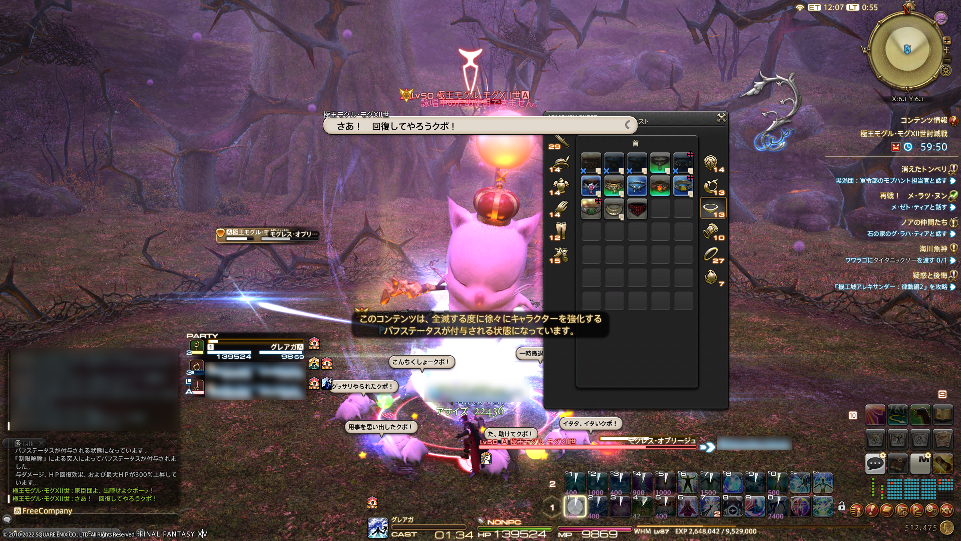 FCメンバーの王子さまというララフェルに、光るモーグリの槍装備を持たせたく。このあと、極王モグル・モグXII世討滅戦連戦へ。