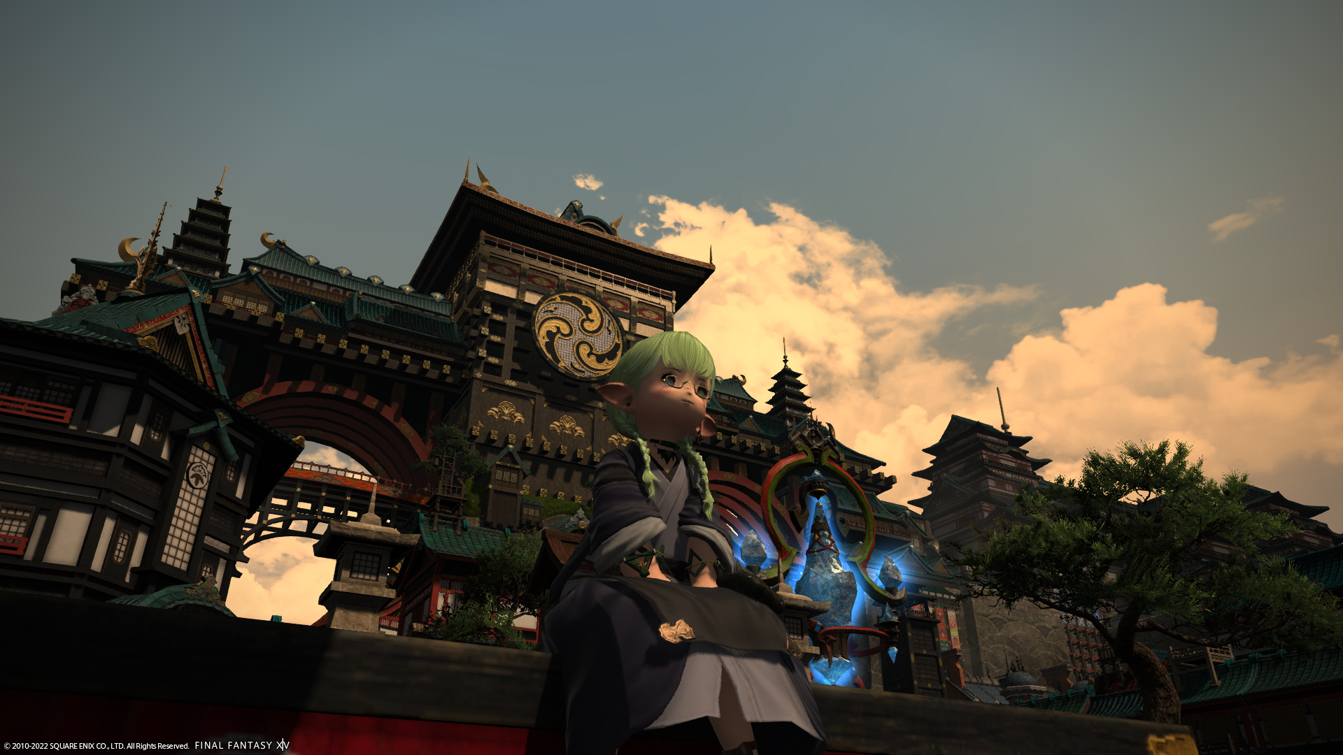 この着物、鬼師胴着という装備で、ちょっと苦労して素材を集めて作ったのです。しかし、同じグラフィックの黒麻胴着(裁縫Lv81)なる装備があって、とってもシンプル素材で作れたらしく…数日後に知ってちっとしょんぼりでした。