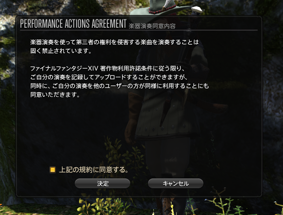 ゲーム内の「楽器演奏」を使用している動画については、演奏されている楽曲がファイナルファンタジーXIVゲーム内で使用されている楽曲(Answers/Dragonsong/Revolutions(アレンジ曲含む)は除く)の場合に限りネット上に公開することができます。