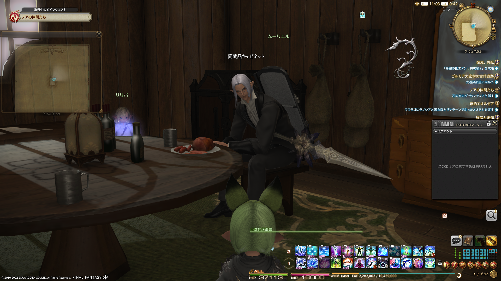 うちの冒険者小隊にて執事役という設定になっております、エレゼンのムーリエルさん。日々、ムーリエルさんの動向をウォッチしているのですが、本日は目の前のお肉をじーっと眺めておりました。