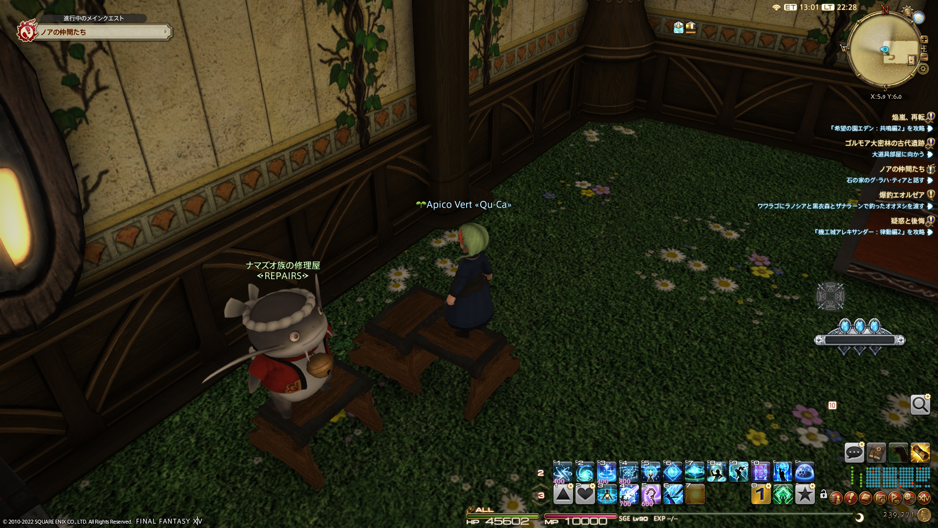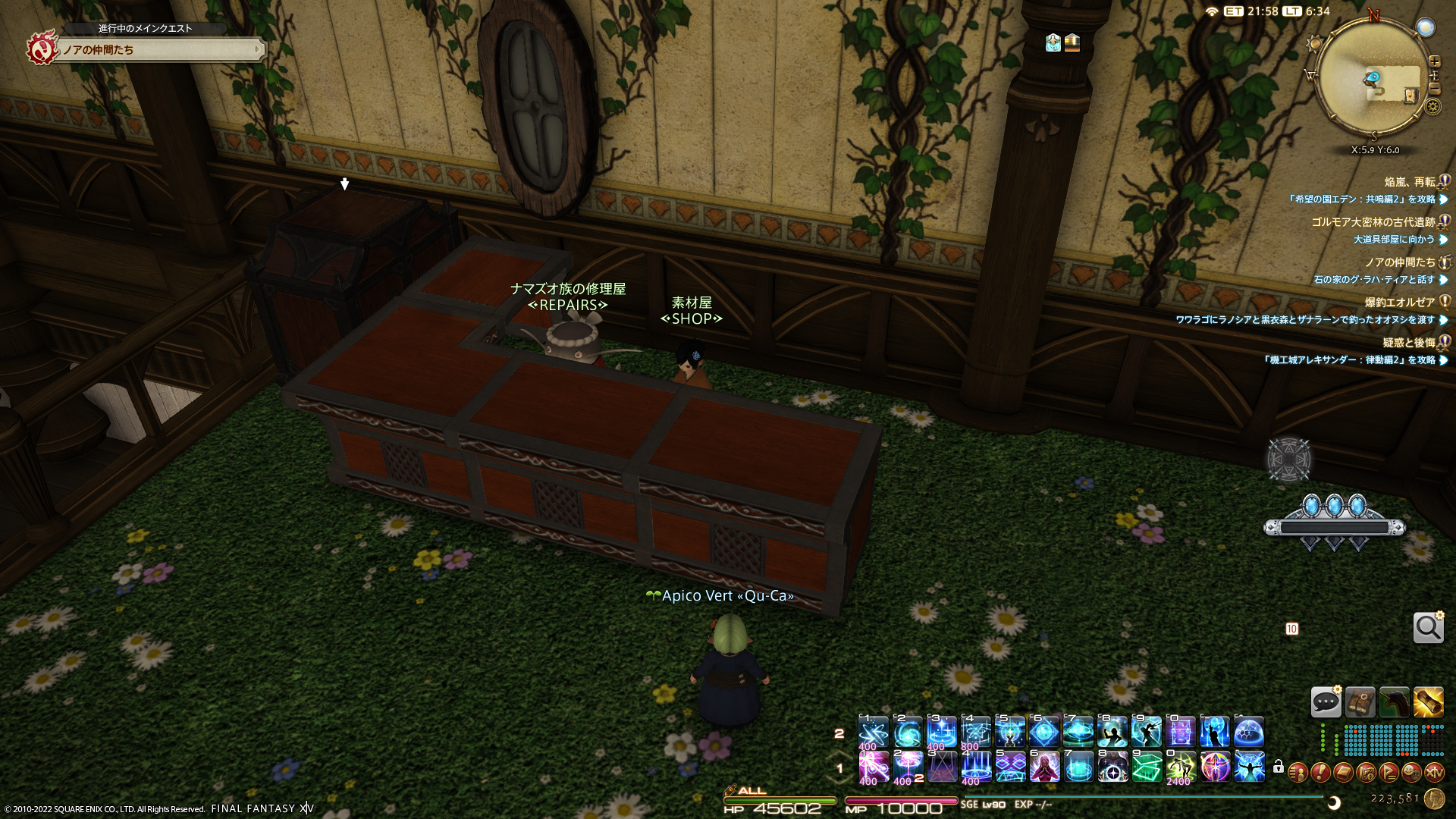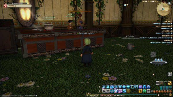 本日、お家に入ると(お家の中でログアウトしても、ログインしたときはお庭になるのですよね)、カウンターが設置されその奥にナマズオの修理屋さんとララフェルの素材屋さんNPCがおりました。