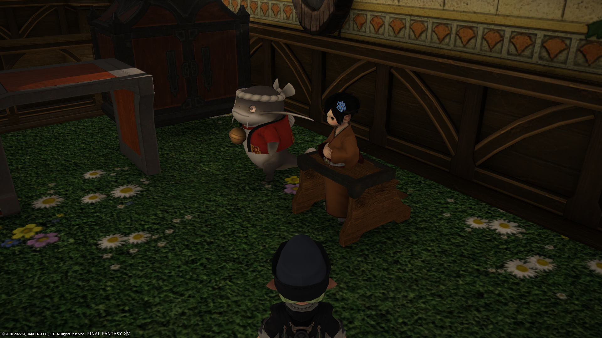NPCをララフェルステップに乗せられたので、カウンターから見やすくなりました、わーい。NPC乗せはマスターしたぞーっ。ちなみに、後ほどもう1人NPCを設置するときに、自分用の踏み台としてファンガーチェアを使ったのですが、うまくゆきました。