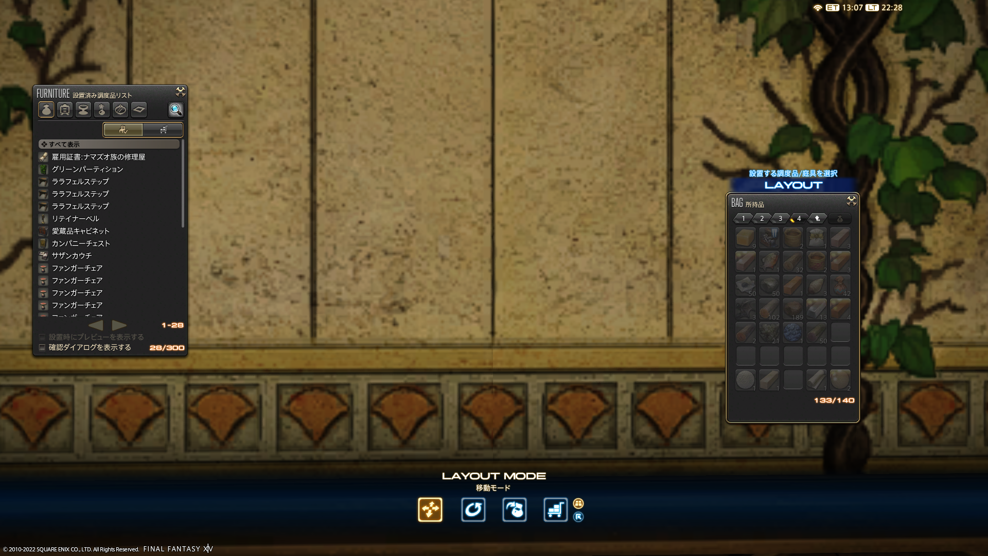 設置したいものと、自分の高さが違うと設置時にエラーになるので、同じ高さに立って設置するのがポイントなのかなぁと思いました。あと、ハウジングメニューに入ったあと、自分や設置したアイテムが移動すると、床のレベルになるので移動しない&させないのもポイントなのかなぁと思いました。