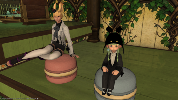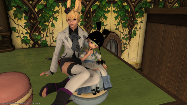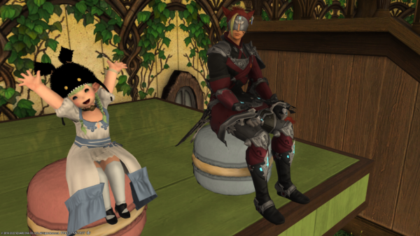 ところで、本日フリーカンパニーのお家をいろいろ手入れしていたのですよ。そうしたら、自分だと座れる椅子に、他の種族だと座れなかったりして。上の写真もそうなのですが。