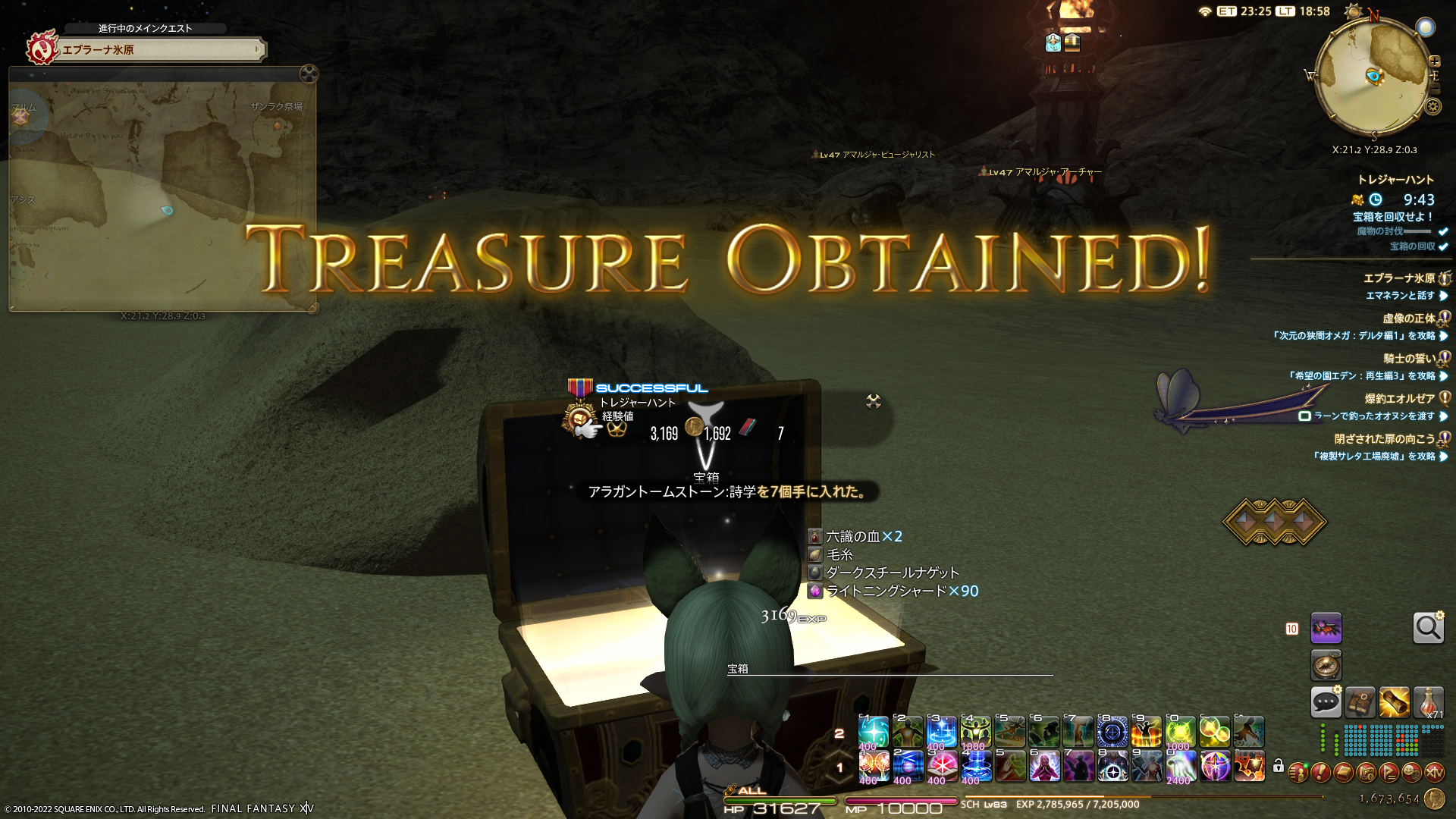 蒼天エリア以降はは初級(1000ギル)・中級(1000ギル)・上級(1500ギル)それぞれ5種のモンスターが指名手配されているので(暁月エリアはしりません!)、各エリア全て倒して回ると17500ギルのおこづかいになるのです。微妙といえば微妙な金額だけど、経験値も入るのでLv上げにもなりますし、モブハントの報酬ポイントもあるので、いろいろ目当てでちょこちょこ倒して回っております。
