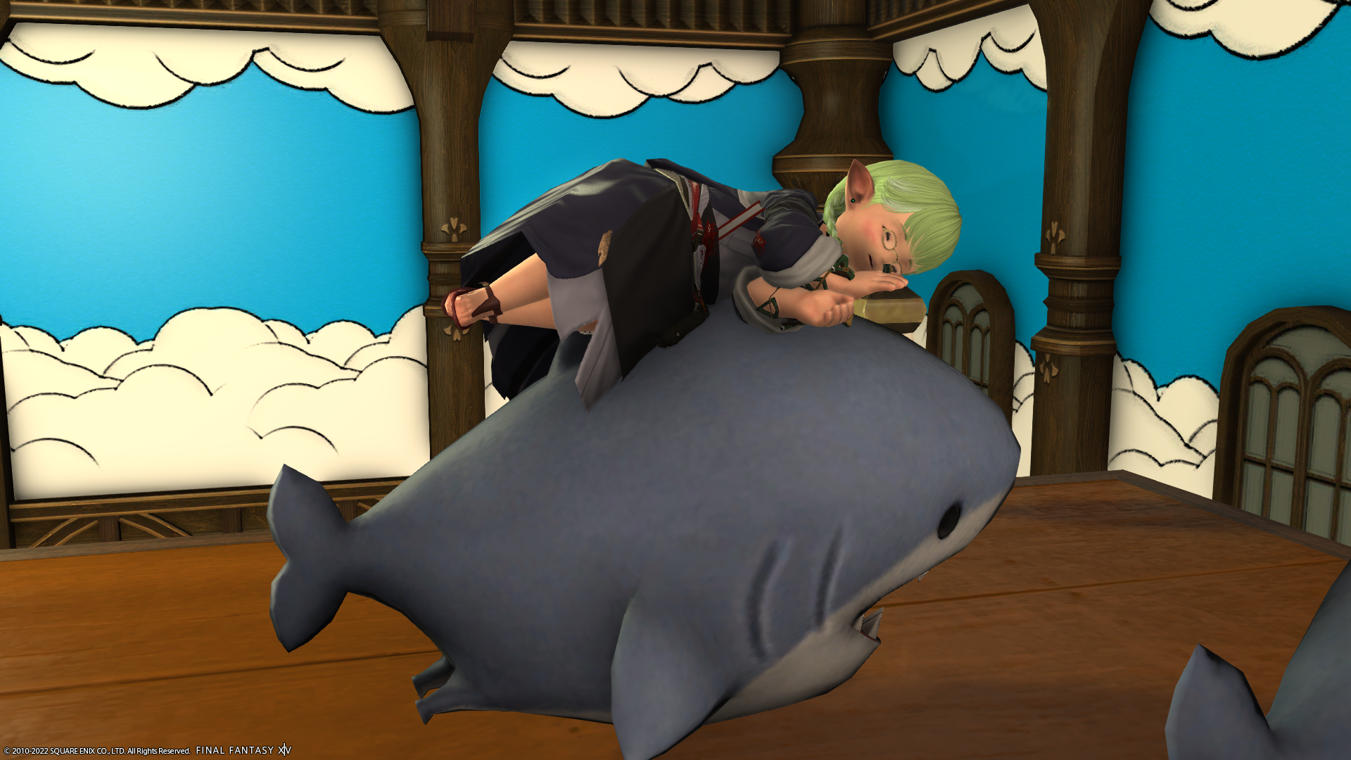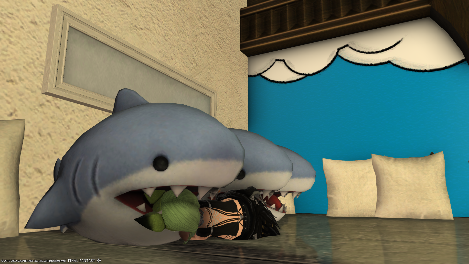 ララフェルだと背が低いのでお部屋にロフトを置きたいよね。ということで、ロフトベッドを作ってみたのですよ。それとロフトのフロアを組み合わせて、ベッドの上にサメクッションを置いたら…