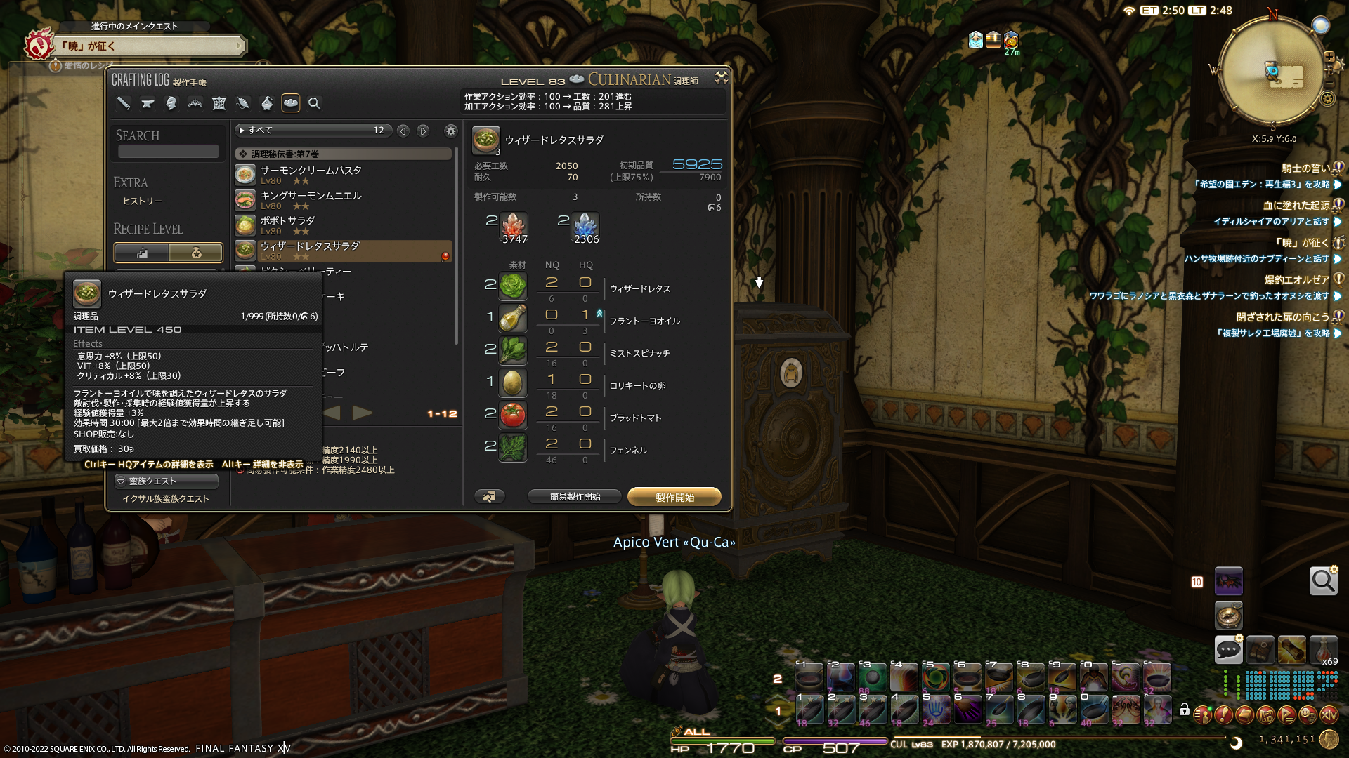 ヴァナ・ディールだと後衛はおやつ系が多かったので、サラダとか新鮮な感じ。でもほんとはスモークチキンというのを作ろうと思ったんですよ…。