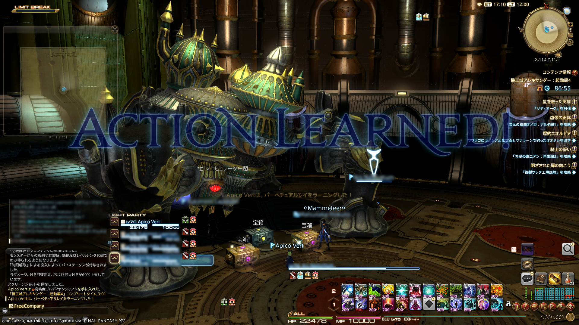 でも、Lvシンクを解除してもわりとすぐに覚えました。あと、覚える覚えないのタイミングがみんな一緒でした。同じタイミングで4人一緒になかよくラーニング。ヴァナ・ディールの青魔道士のラーニングだと、個人によってランダムで覚えるので、1人だけ覚えないとプレッシャーでしたよね…。