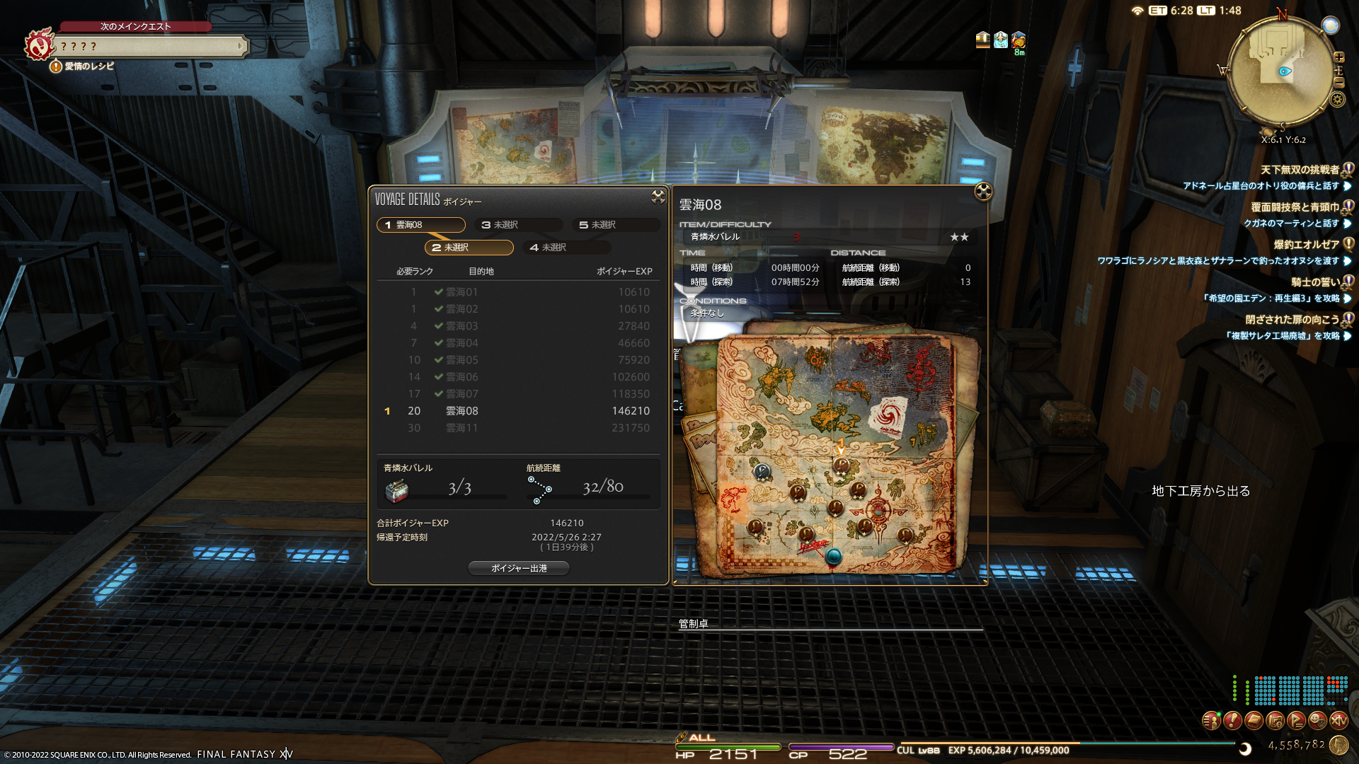 最初は探索に行ける場所が少ないのだけど、探索中新たな航路を見つけたりして、徐々に行き先が増えるようになっております。潜水艦の方は順調に行き先を増やしているのだけど、飛空艇の方がなかなか開放されなくって……。