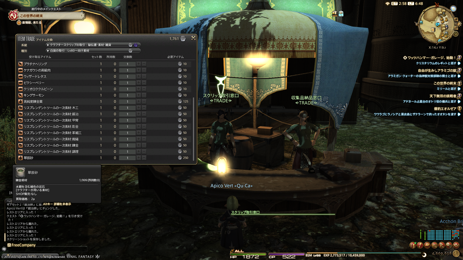 どちらもけっこうレートが高い上、翠辰砂は1つの装備を作るのに3~4個必要なのでスクリップが足りないよー!という事態に。お得意様では追いつきません。