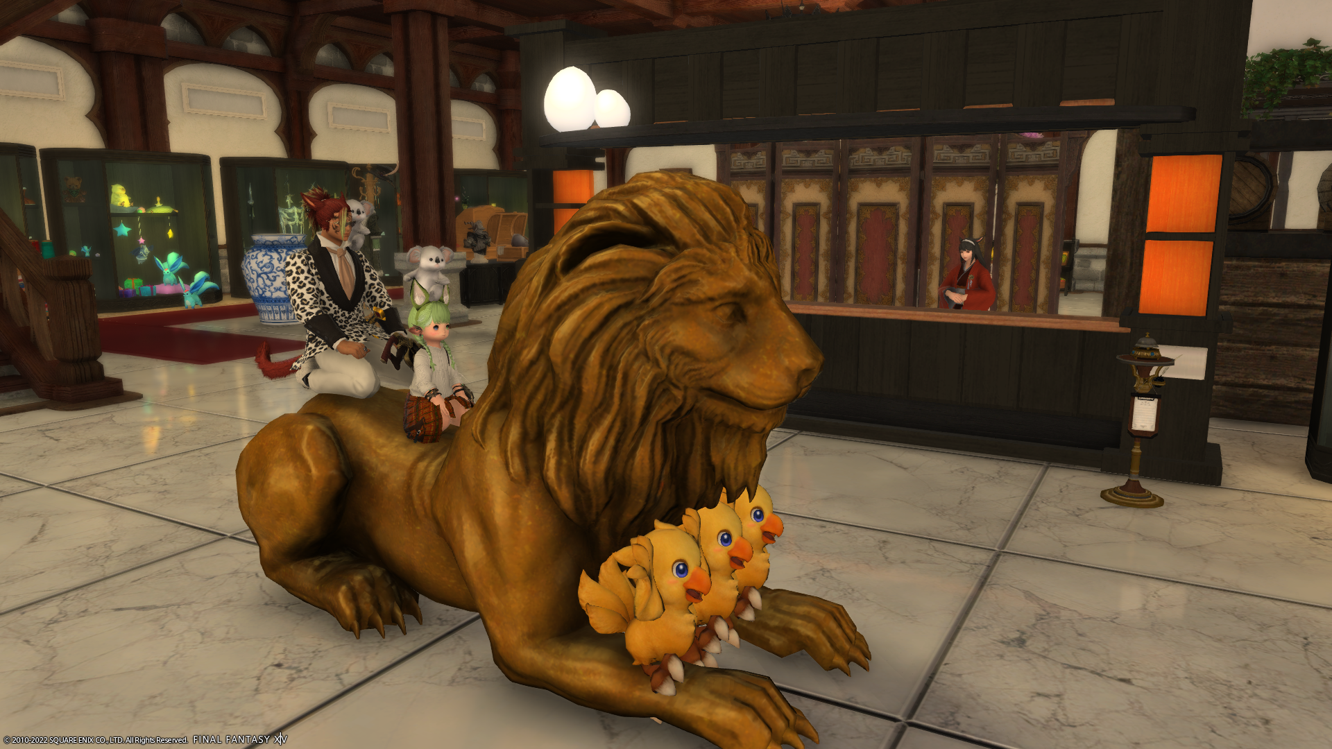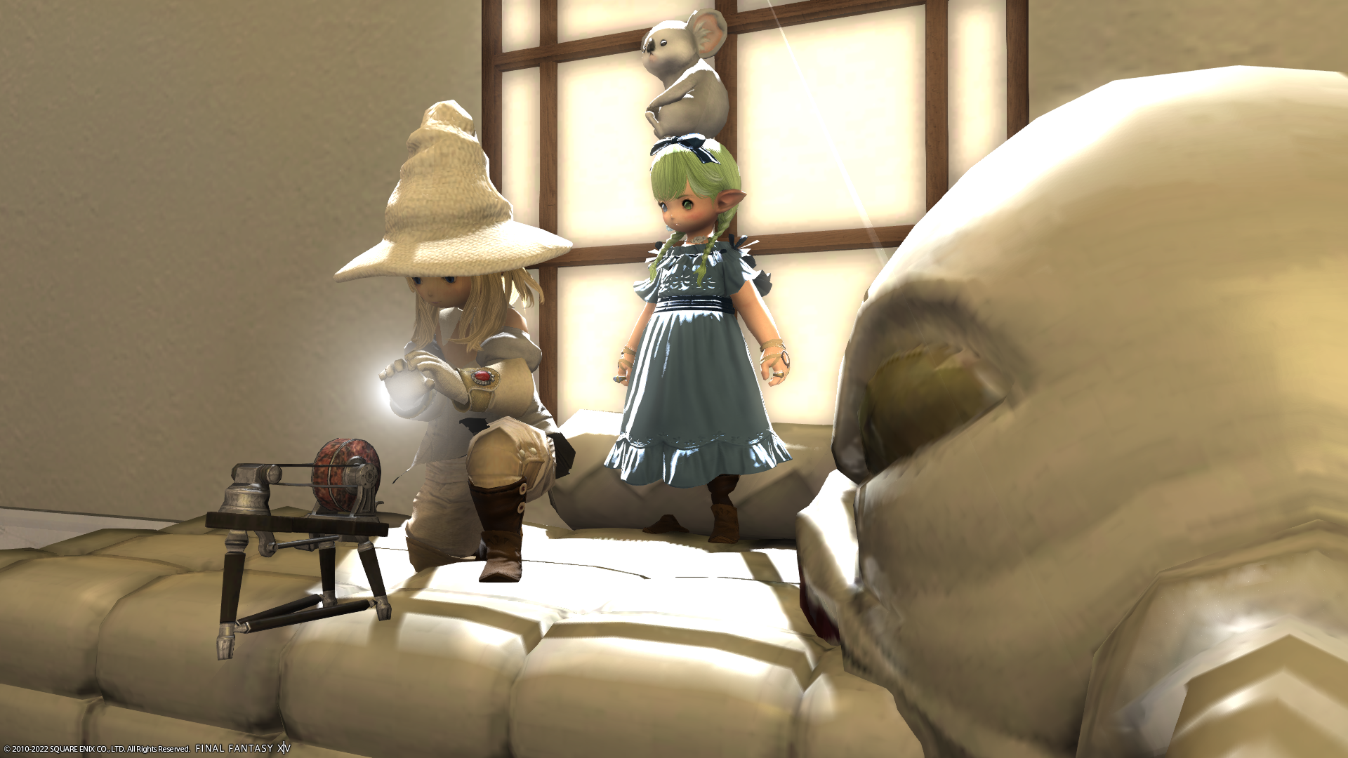 双剣士のクラスクエストをできるところまで終わらせて、フリーカンパニー(FC) ハウスの自分のお部屋に戻ると、先日設置したプリンソファの上でFCメンバーさんの倉庫ちゃんがせっせとクラフター業をしておりました。