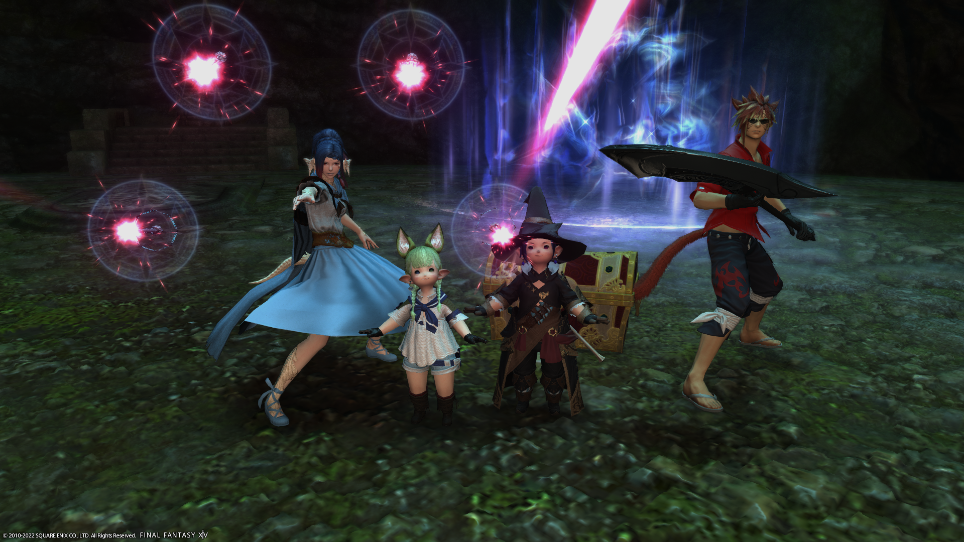 扉の解錠時には毎度ポーズを取るフリーカンパニーメンバーさんたち。
