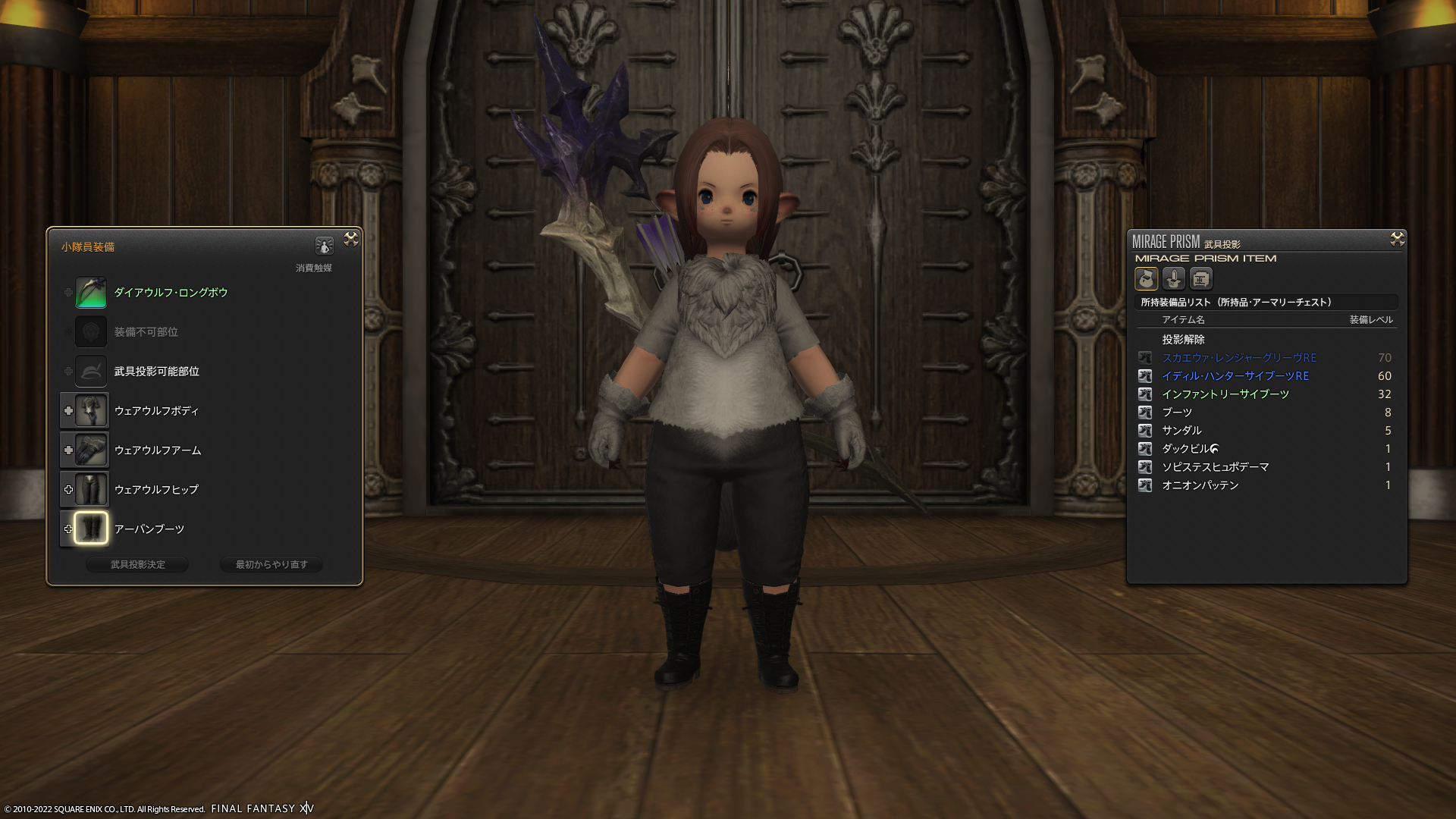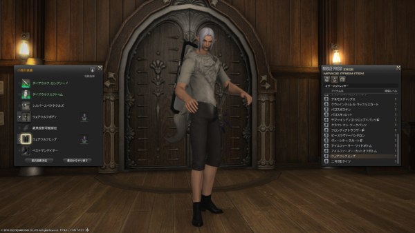 ウェアウルフ装備一式は基本男女兼用のようなのですが、足だけ男女別になってるようで、足装備を履かせようとしたらいくら探しても出てこなくって。それで気がついたのでした。