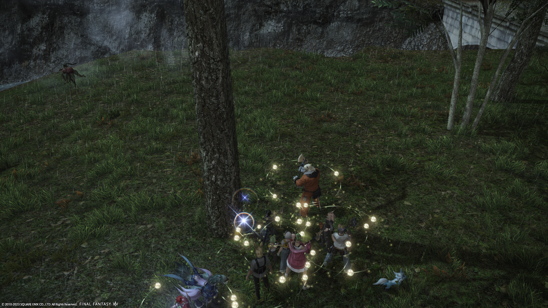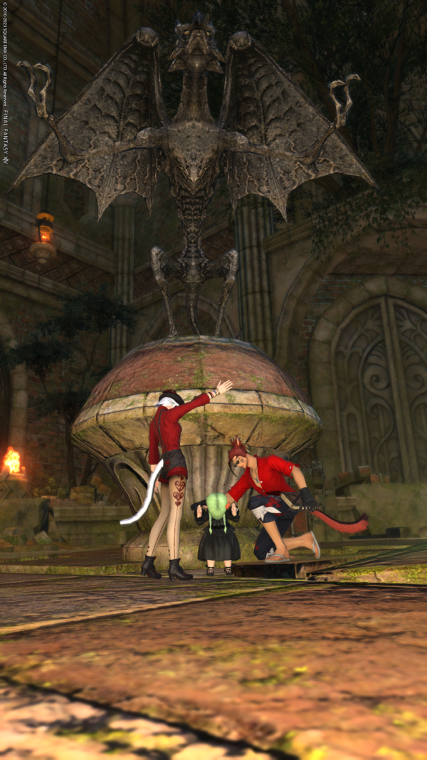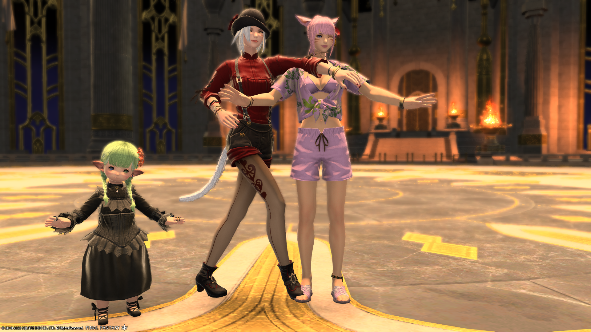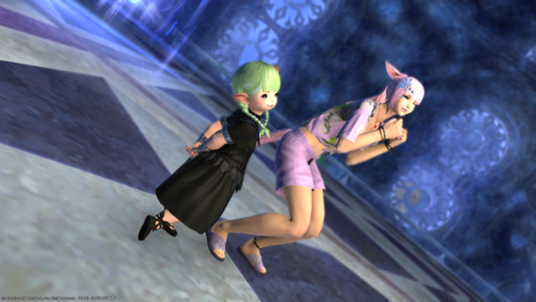 お手伝いにいったダンジョンにて、怖がるララフェルとなぐさめるミコッテさんたちの図。