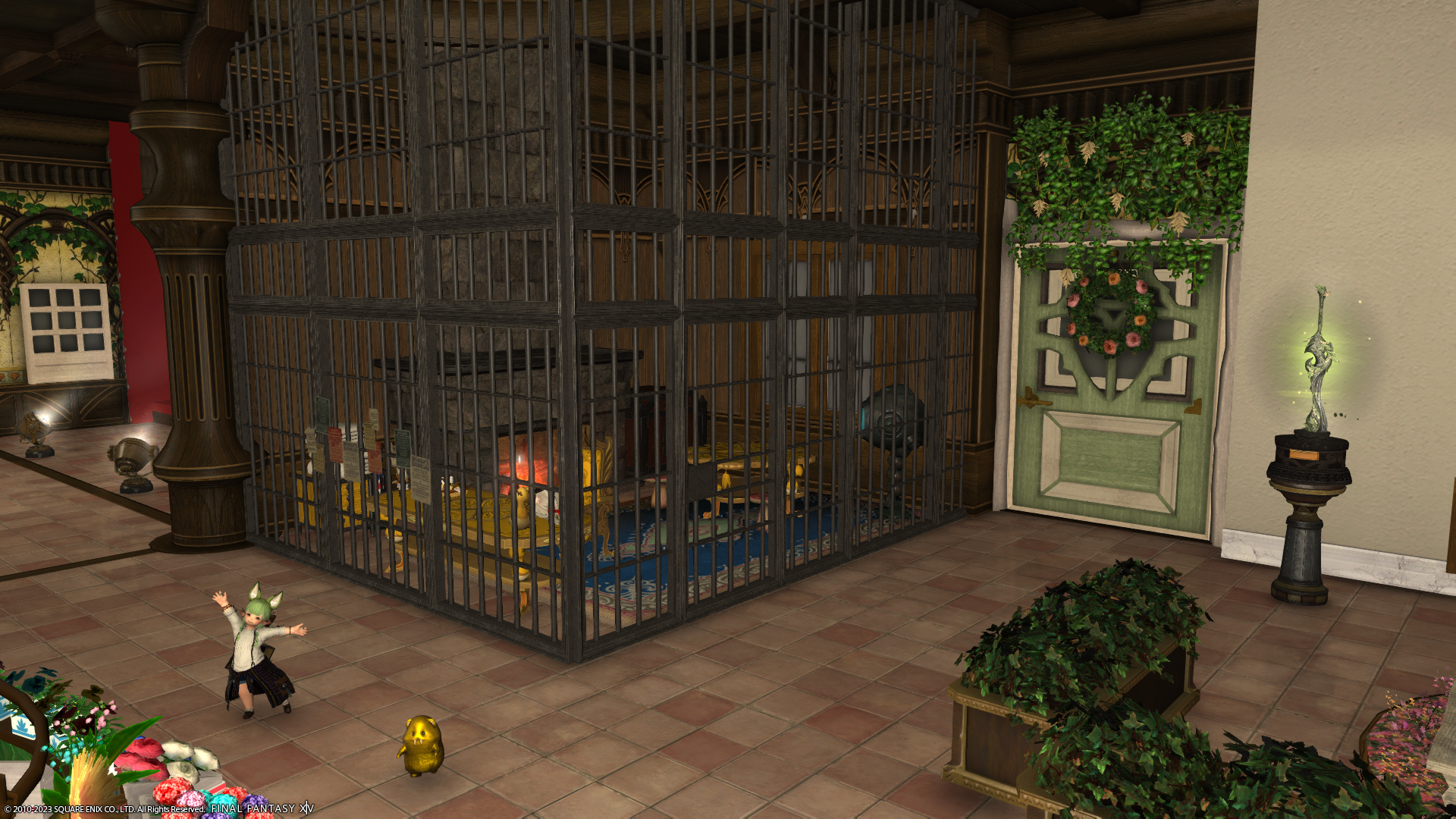 入ってすぐ右に、フリーカンパニーメンバーのミコッテさんの檻が設置されております。これ、対人戦績でいただける家具らしく、ミコッテさん自らもらってきて設置しておりました。
