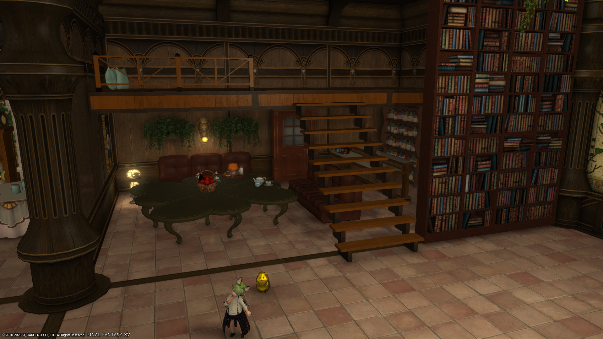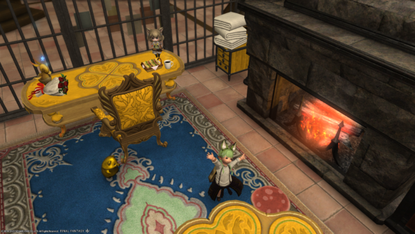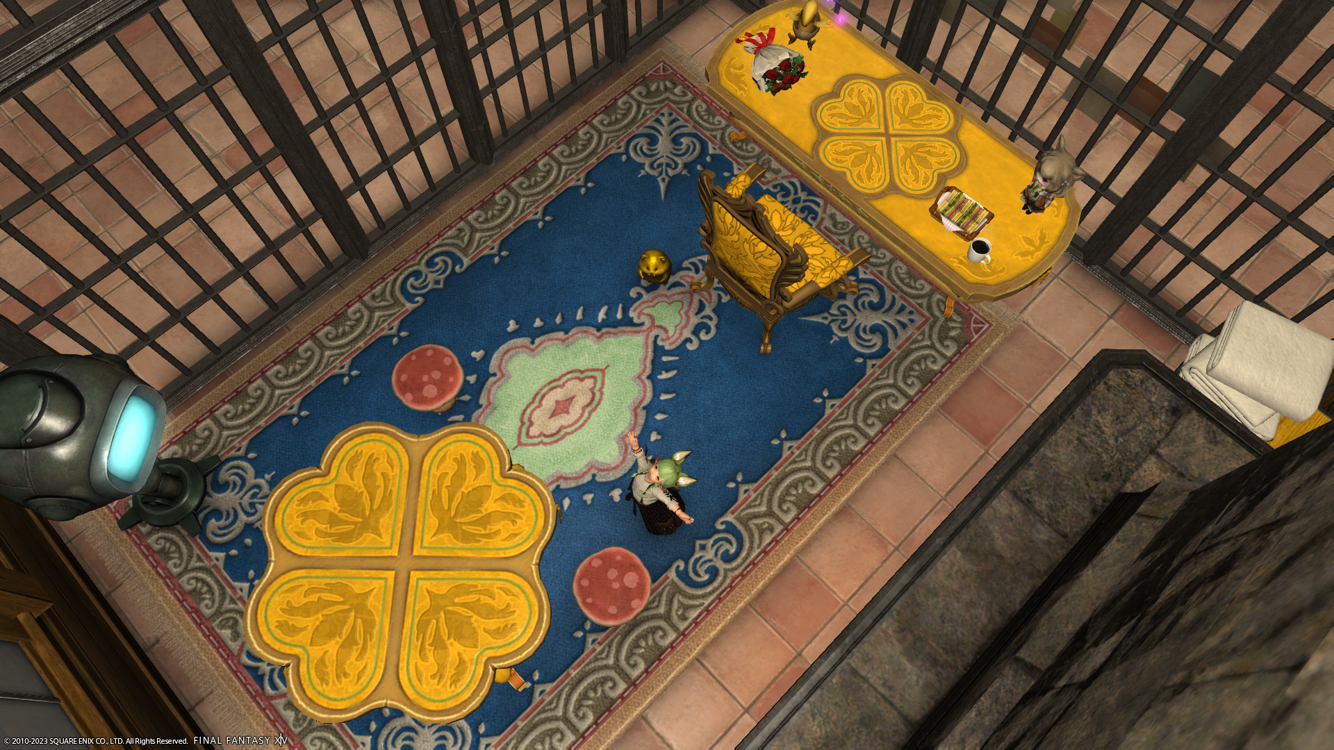 ミコッテさん、自身の個人ハウス(L)を買うときにシャッキンをしていて、まだ返済が終わっておらずで。クロちゃんのお人形はシャッキン主さんが置いていったものなのです。きっと監視カメラが内蔵してあると思うので、監視しやすいようにミコッテさんのお部屋に設置です。
