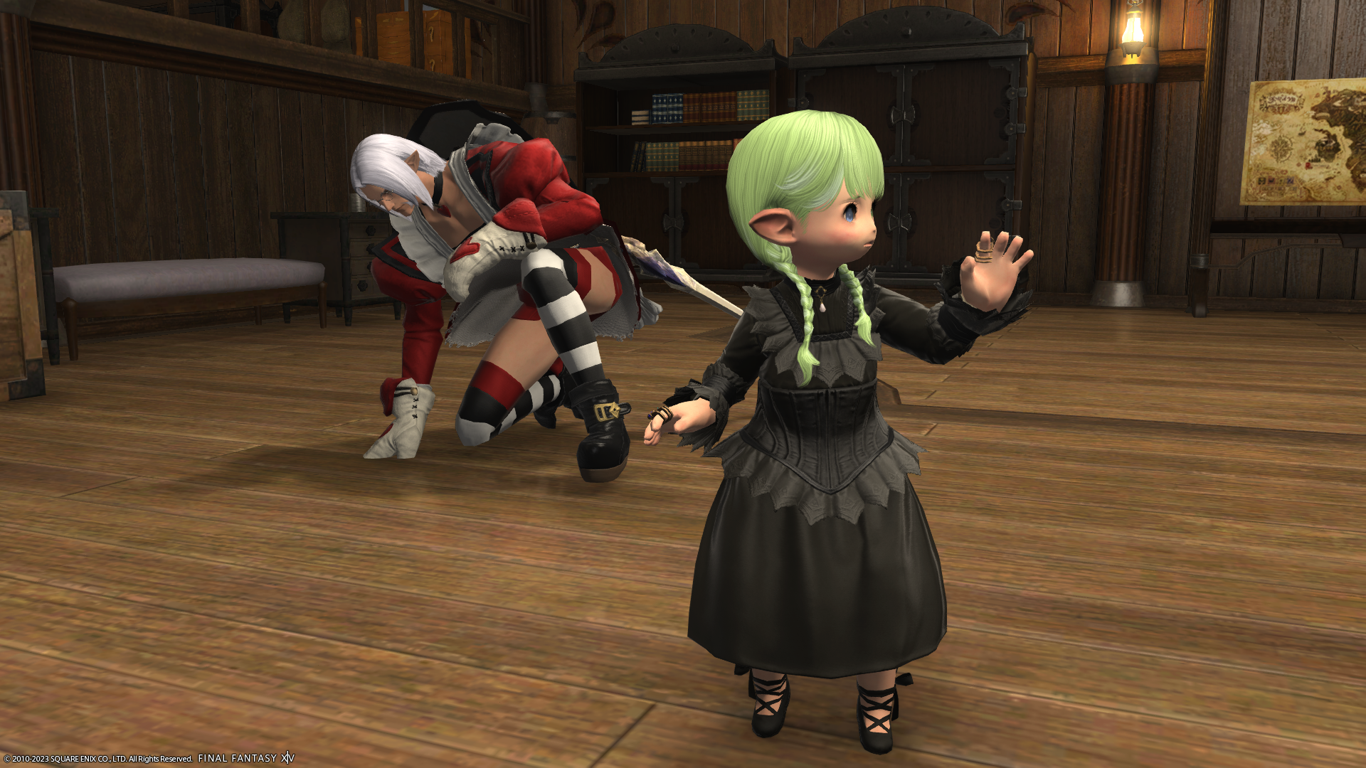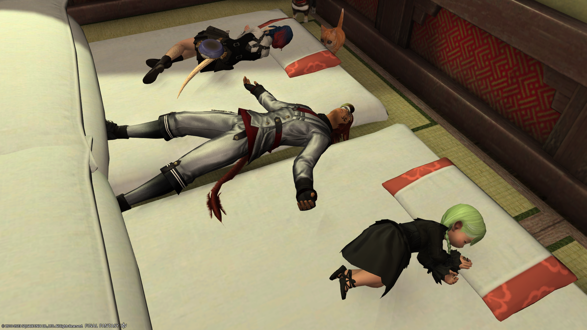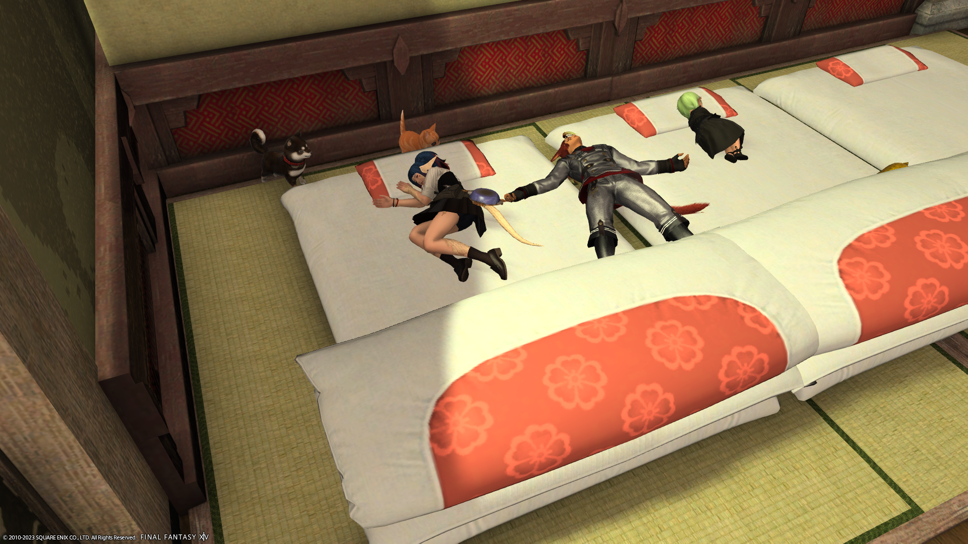 フリーカンパニーメンバーのアウラさんと、フリーカンパニーハウスのおふとんで並んで寝たまま席を外して戻ってきたら…。
