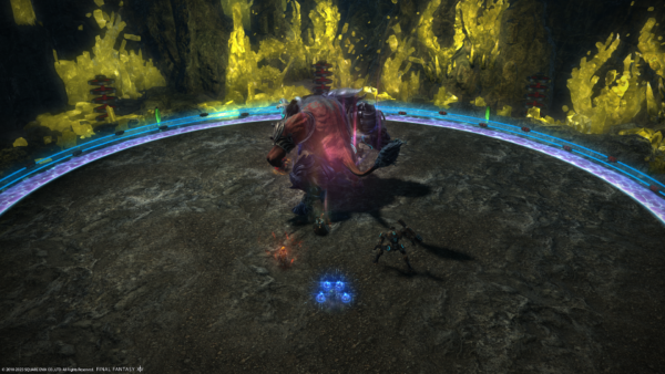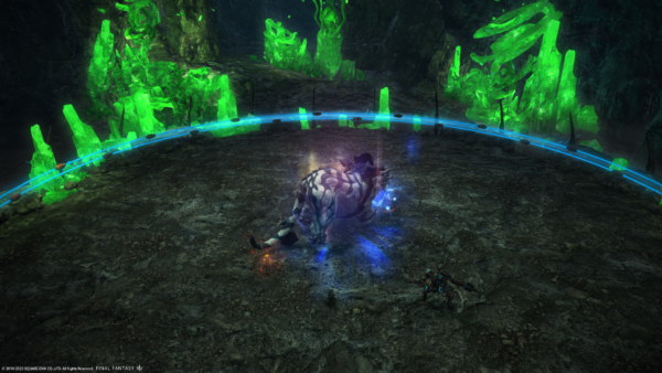 ちなみにこれは、線がついている人に4回連続で弱体デバフつきダメージが来るので、4人で交代してダメージを受けるというギミックなのです(2回連続でダメージを受けると転がる)。