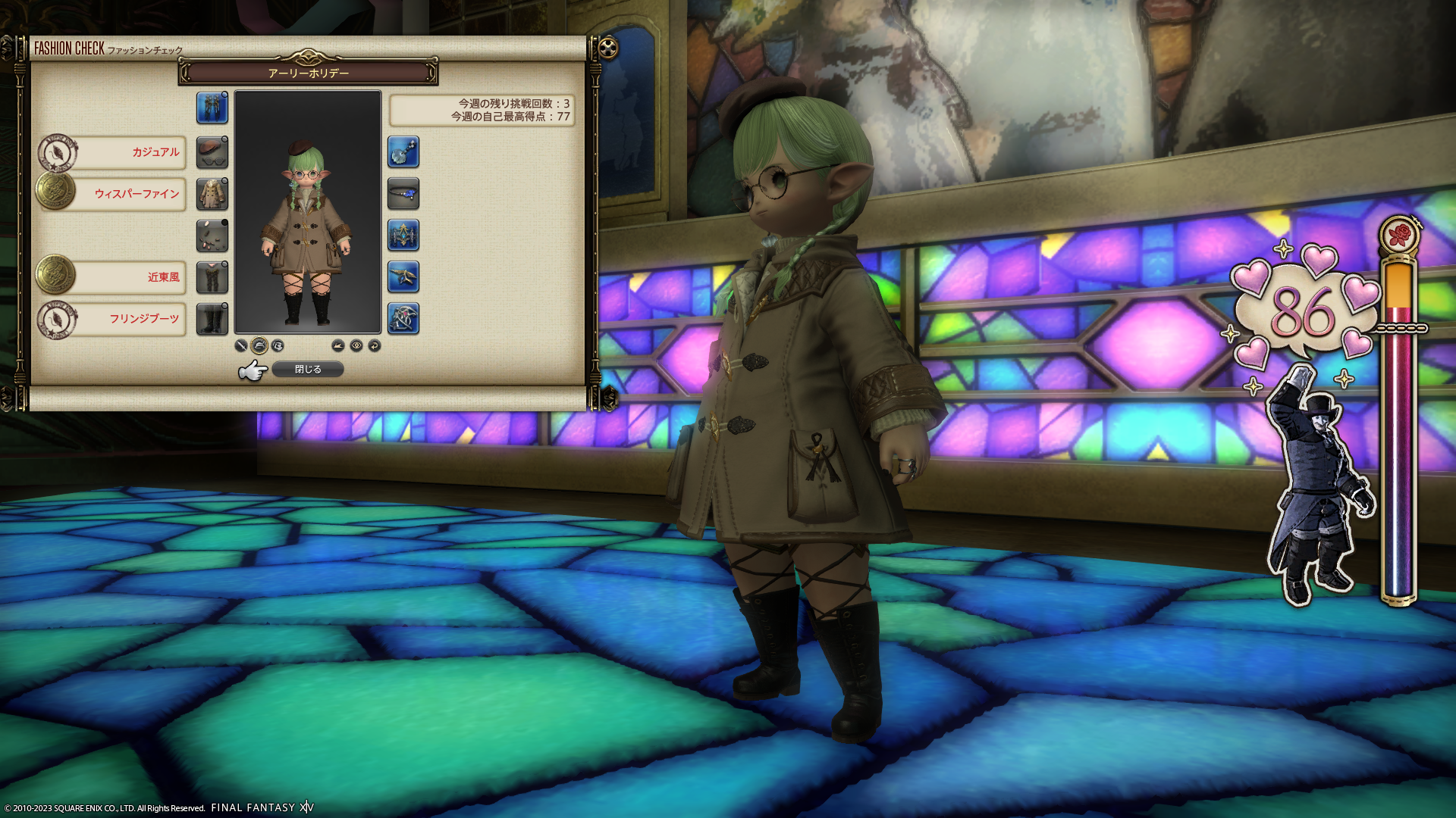 今週のファッションチェックは無事合格点。割りとへんな格好……。