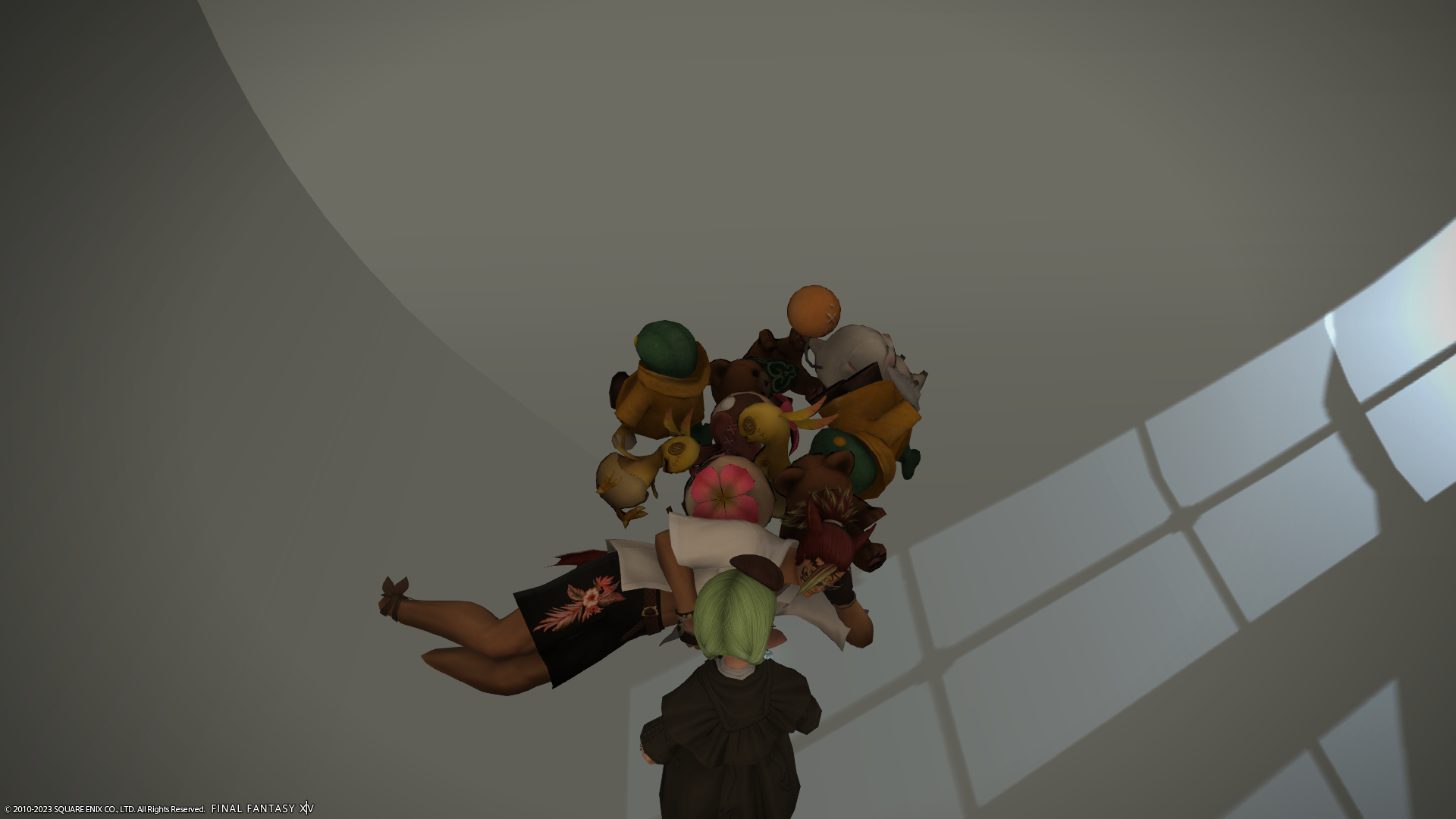 ホワイトスクリーンとお布団を使ってぬいぐるみと寝られるようにしてみたのだけど、ララフェル以外の種族だと、脚が壁(ホワイトスクリーン)に埋まっちゃう。