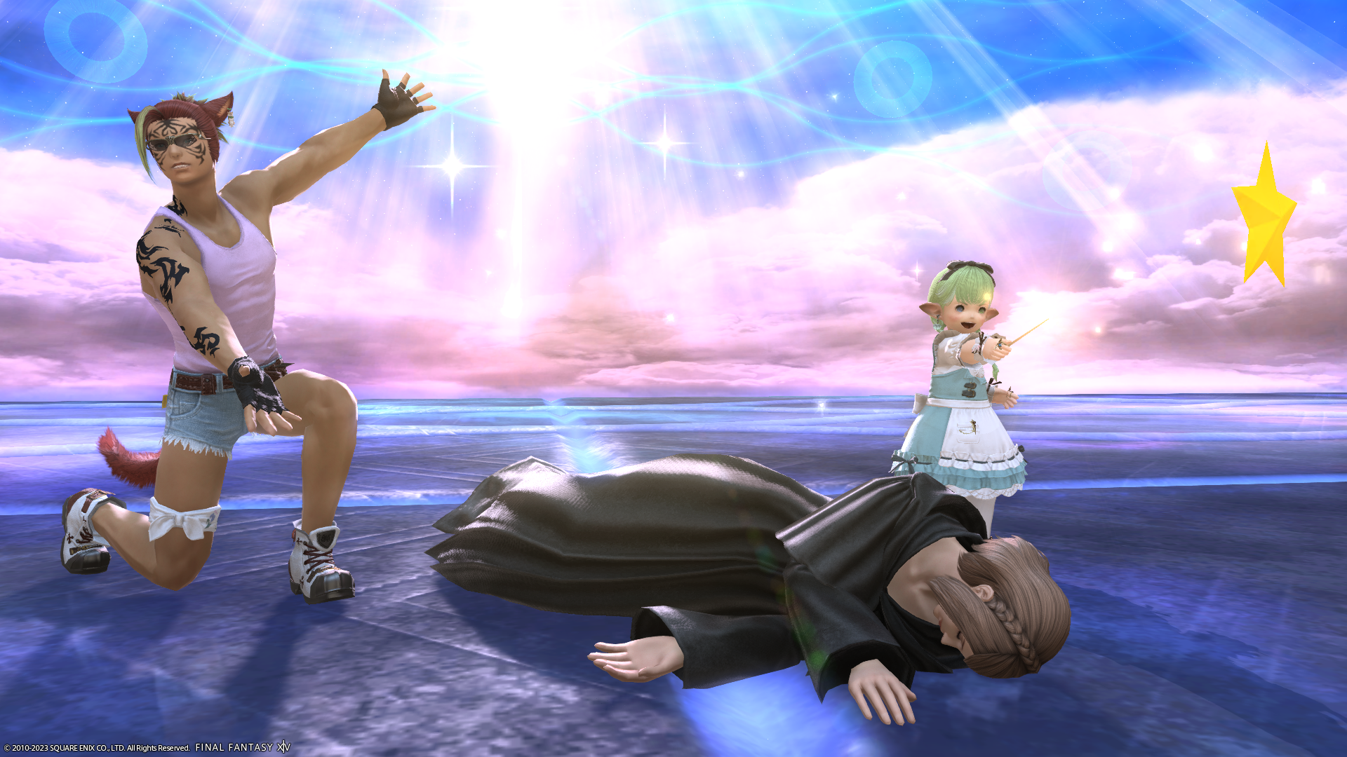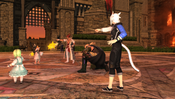 最近転がらない王子(右)が久々に転がって(戦闘不能になって)満足?です。※フリーカンパニーでは王子と遊ぶことを王子コロガスというくらい、王子は転がるのがお仕事でした。