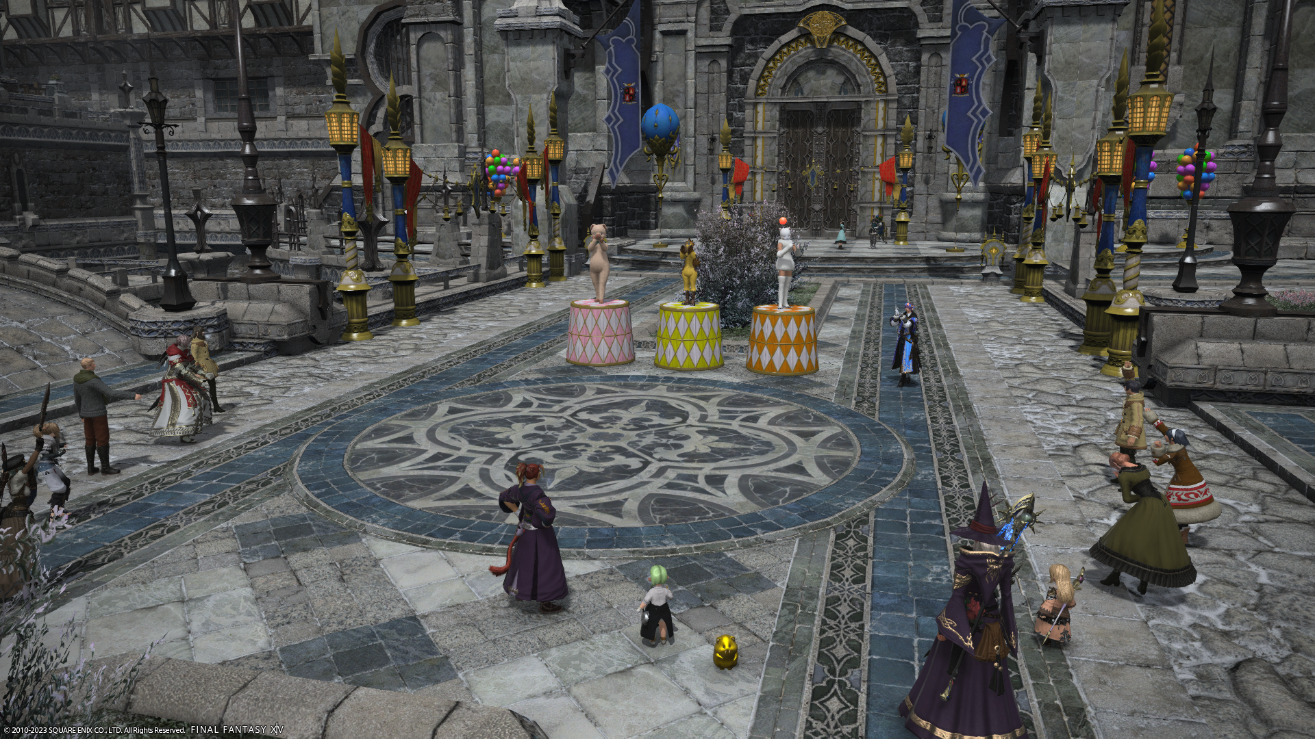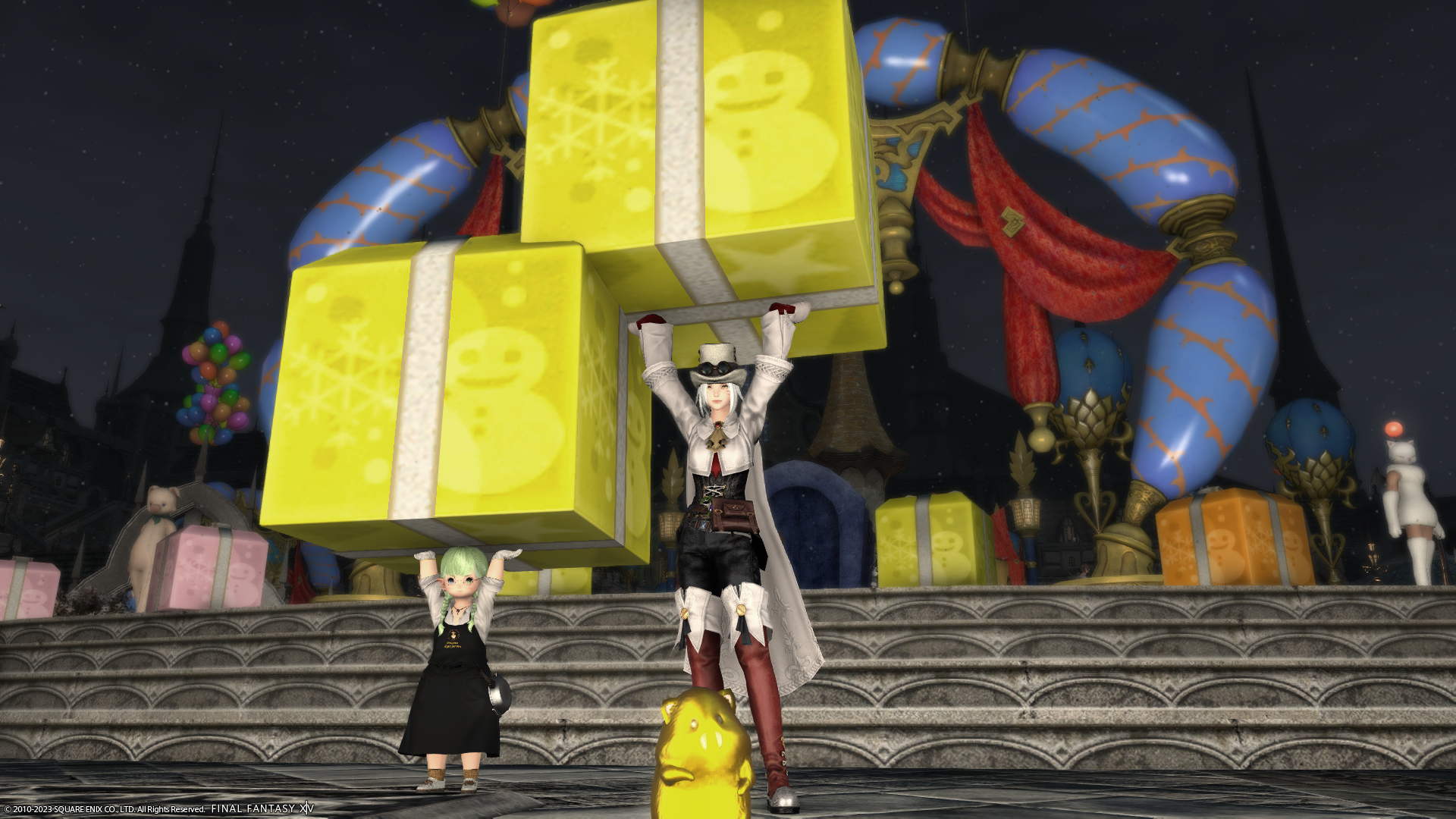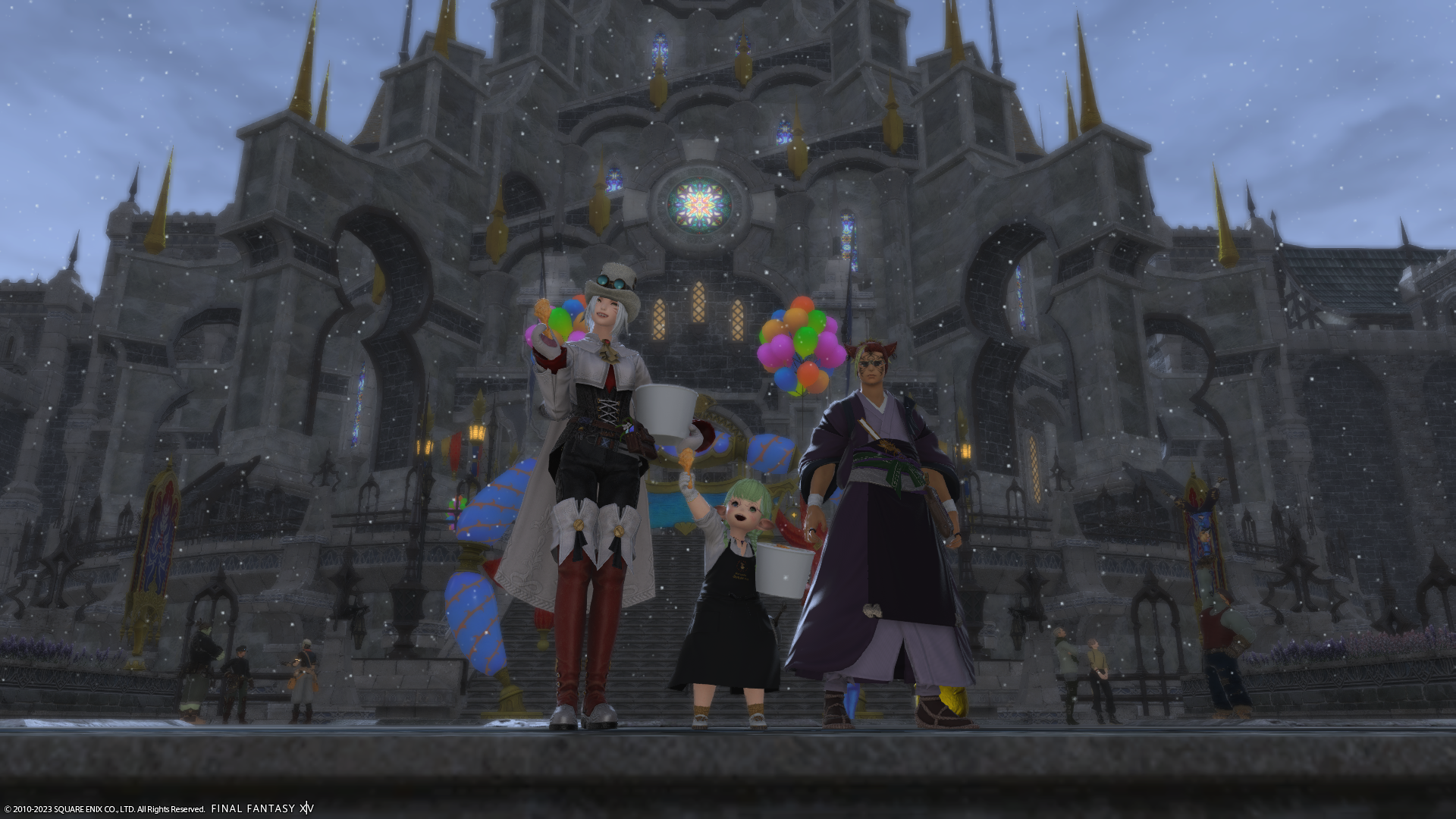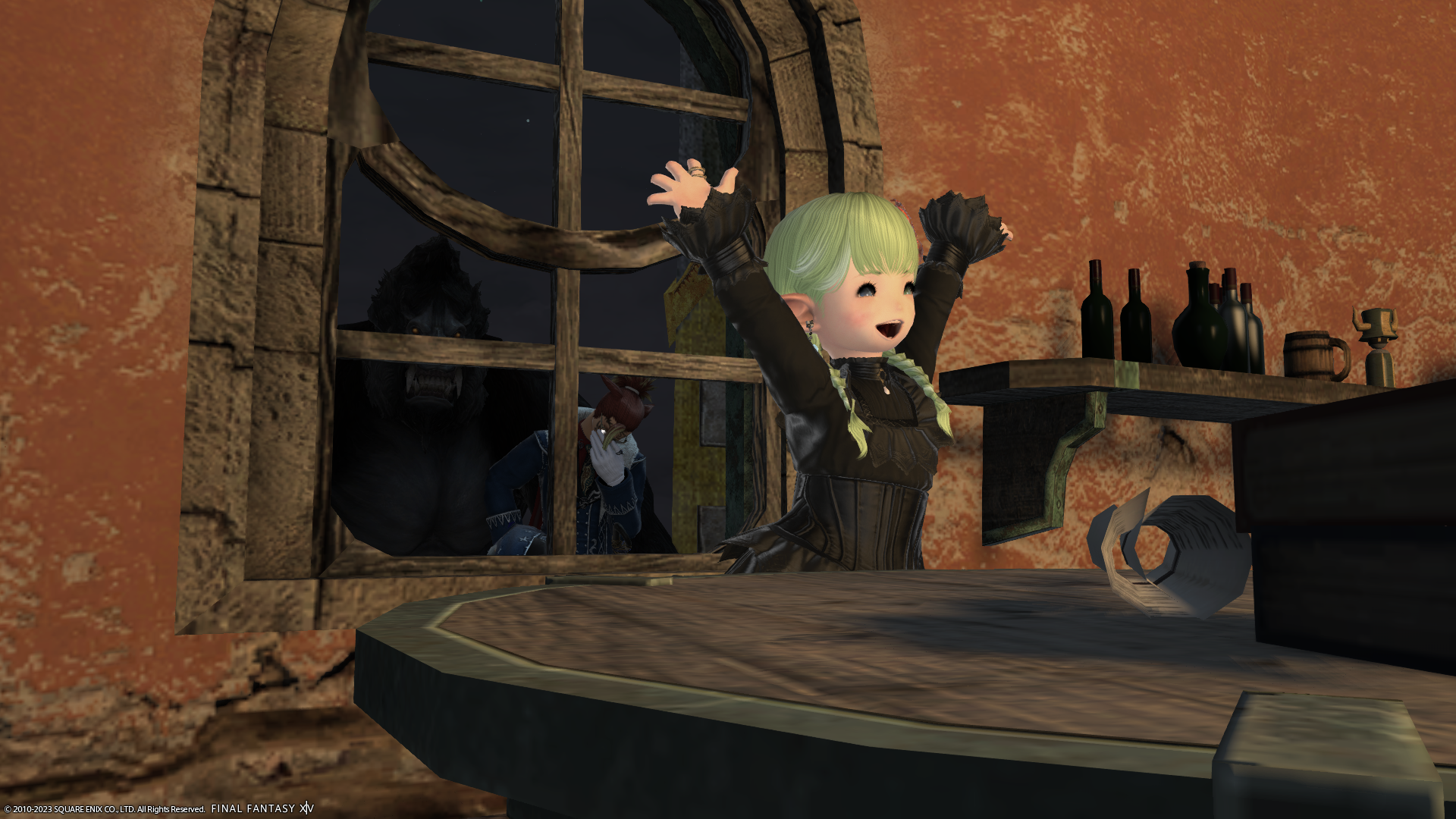 窓の外、よく見ると入れないミコッテさんが泣いてます。むふー。入りたければララフェルに転生してください!