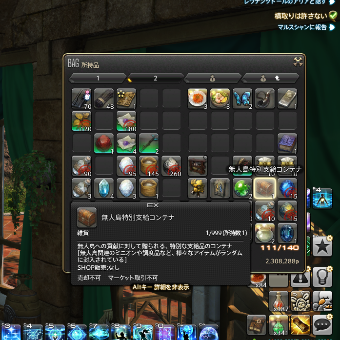 先日、無人島の開拓がひと段落して、ねこみみさんからのお願いが発生するようになりました。ねこみみさんのお願いしたアイテムを島で生産すると、専用のポイントがもらえるのです。そのポイントがちょっとだけ貯まったので、無人島特別支給コンテナと交換してみたよー。
