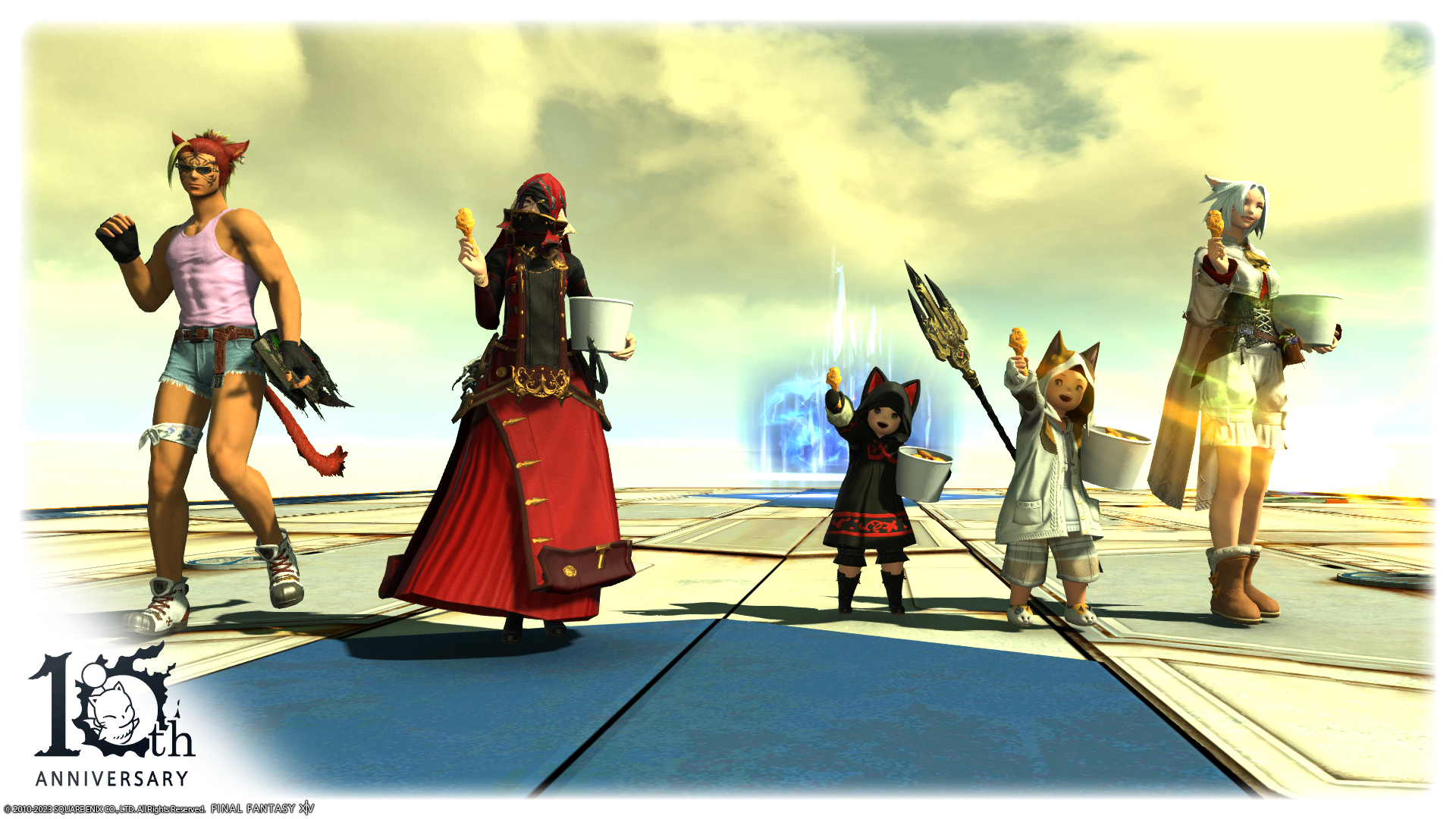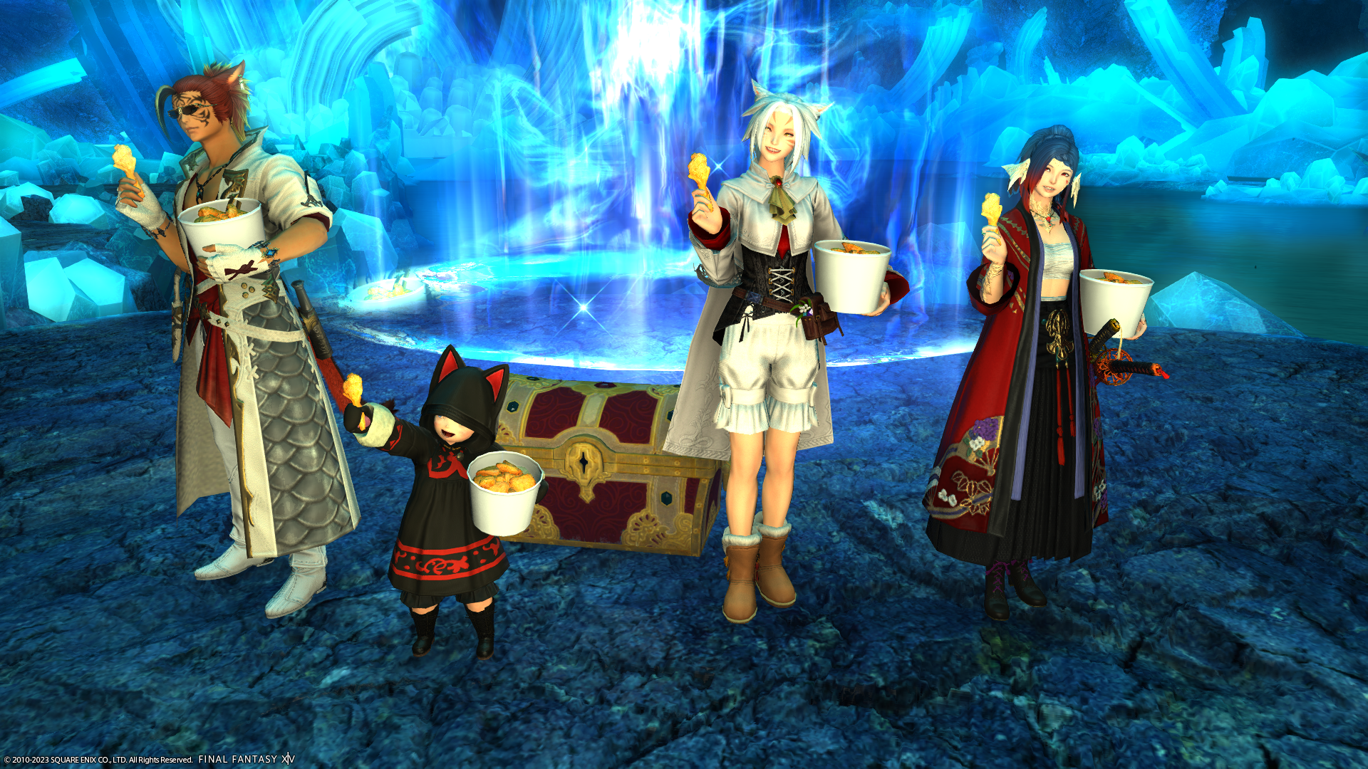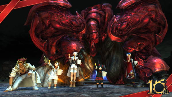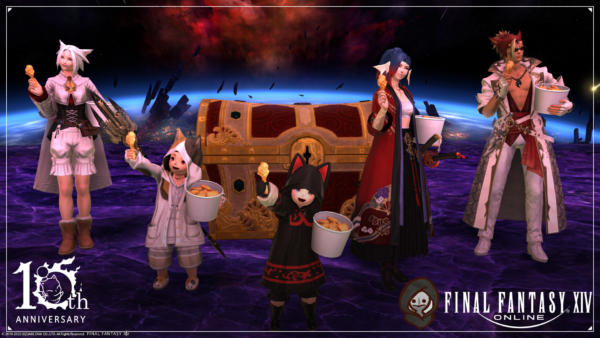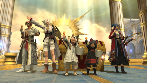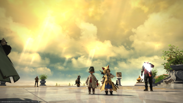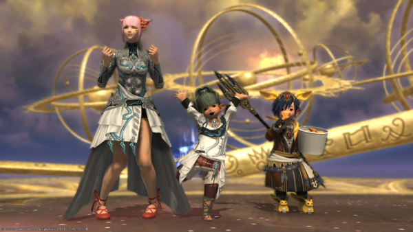 ミニオンレスキューのゴール地点にて、ミコッテさんを後ろから押すなよ押すなよしようとしている悪いララフェルの図。