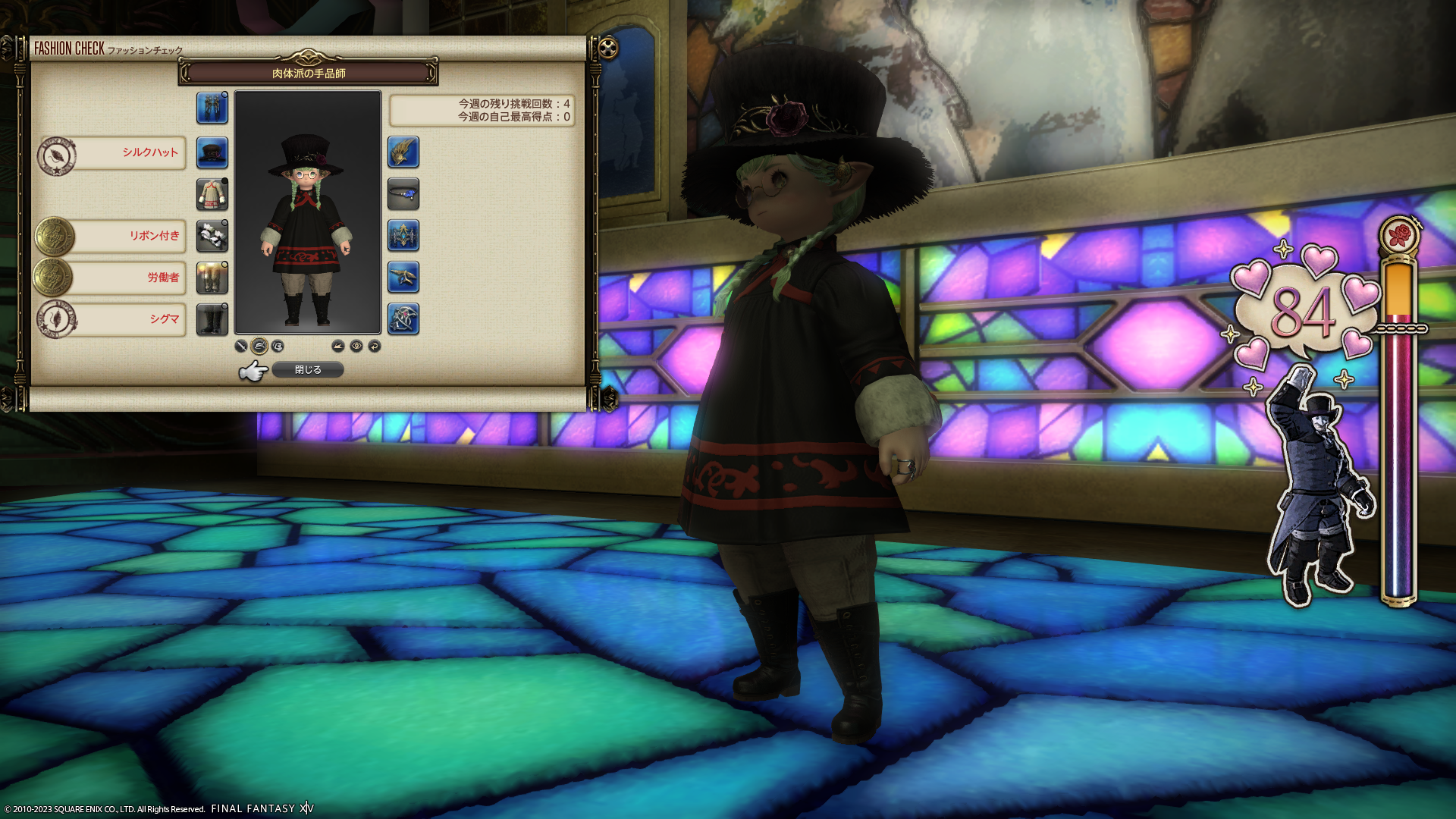 頭のお題がシルクハットだったからそれっぽい形の装備をかぶってみたけどだめでした。手は、メイド服の手で大丈夫だったようです。あと、カバンにはいっていたアマチュアスロップスを履いて合格。