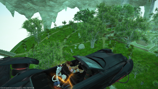 後部座席に座りたかったのに、先に埋まっていたため無免許ミコッテさんの隣の席に座ることになってしょんぼりしているララフェルの図。