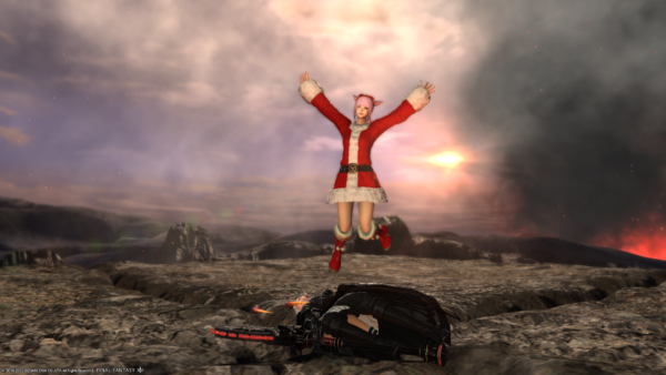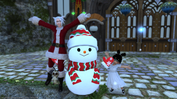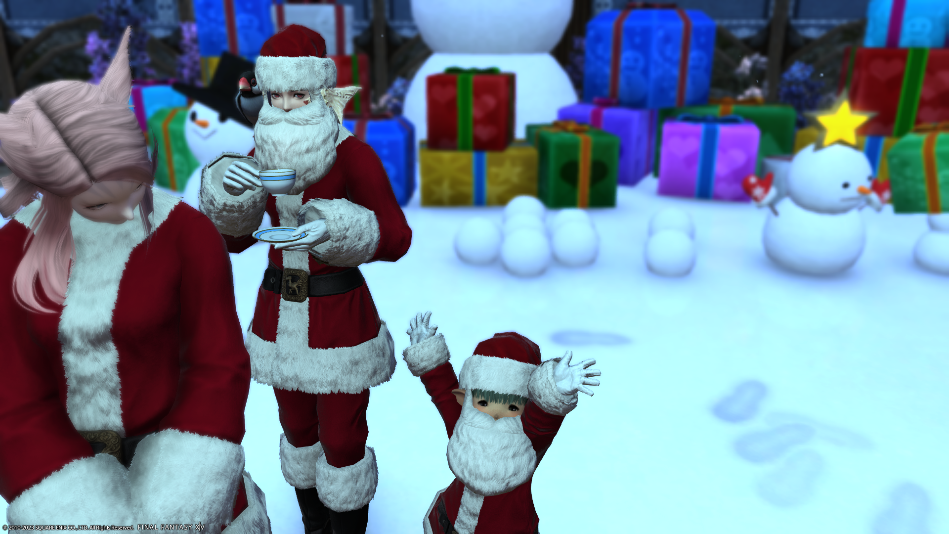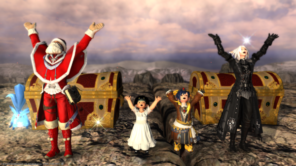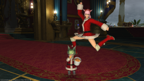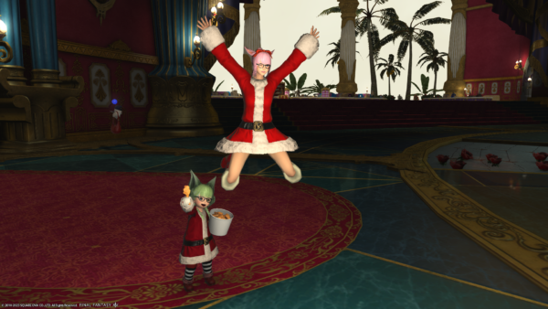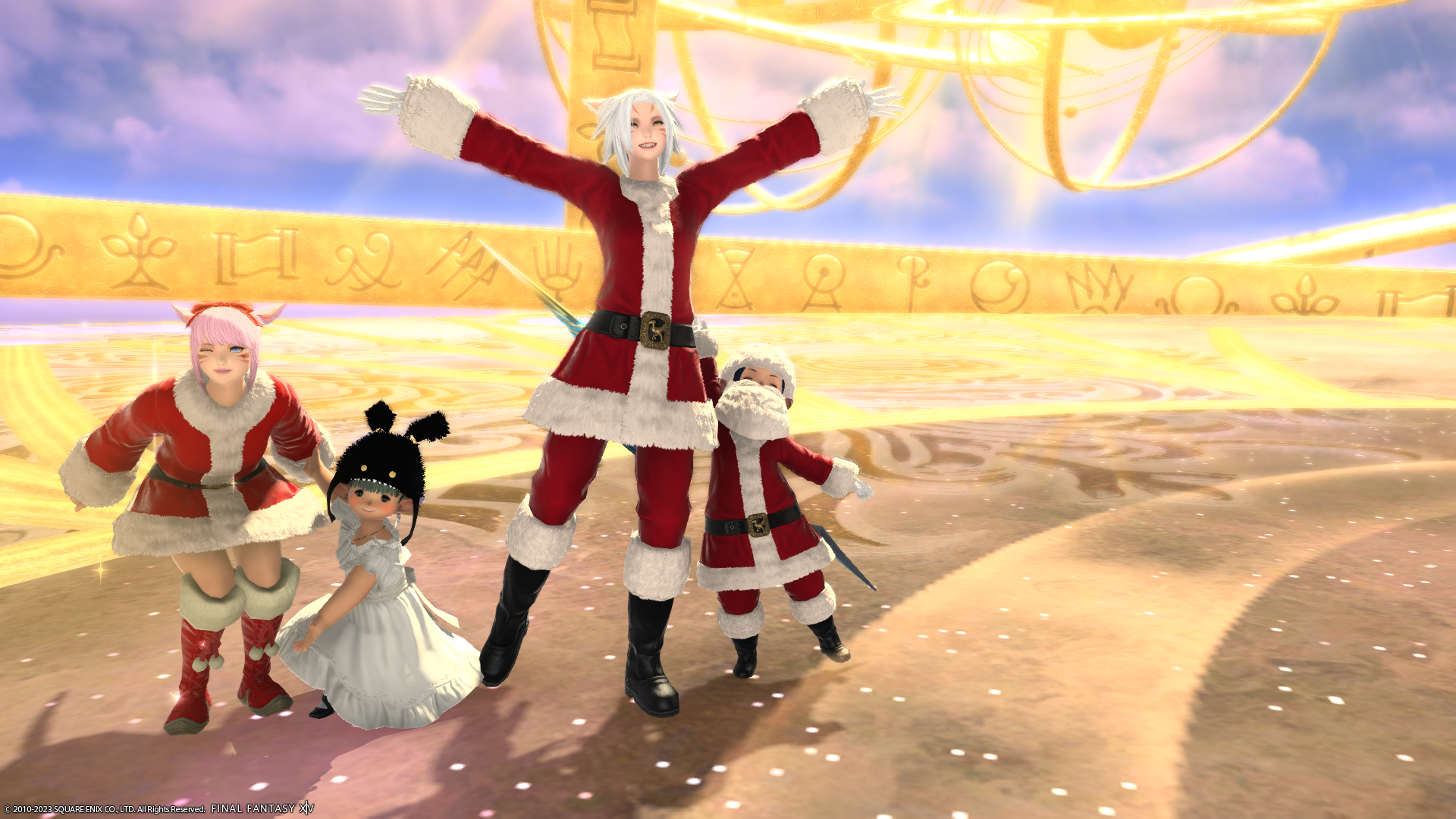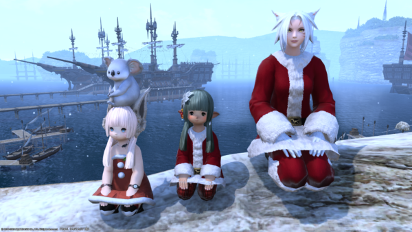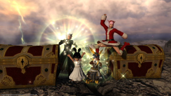 わたくしの倉庫ちゃんだけサンタ服でないのがさみしいショット。左端のミコッテさんがハッピージャンプしちゃうとぱんつが見えちゃうので、ジャンプする前を撮影。