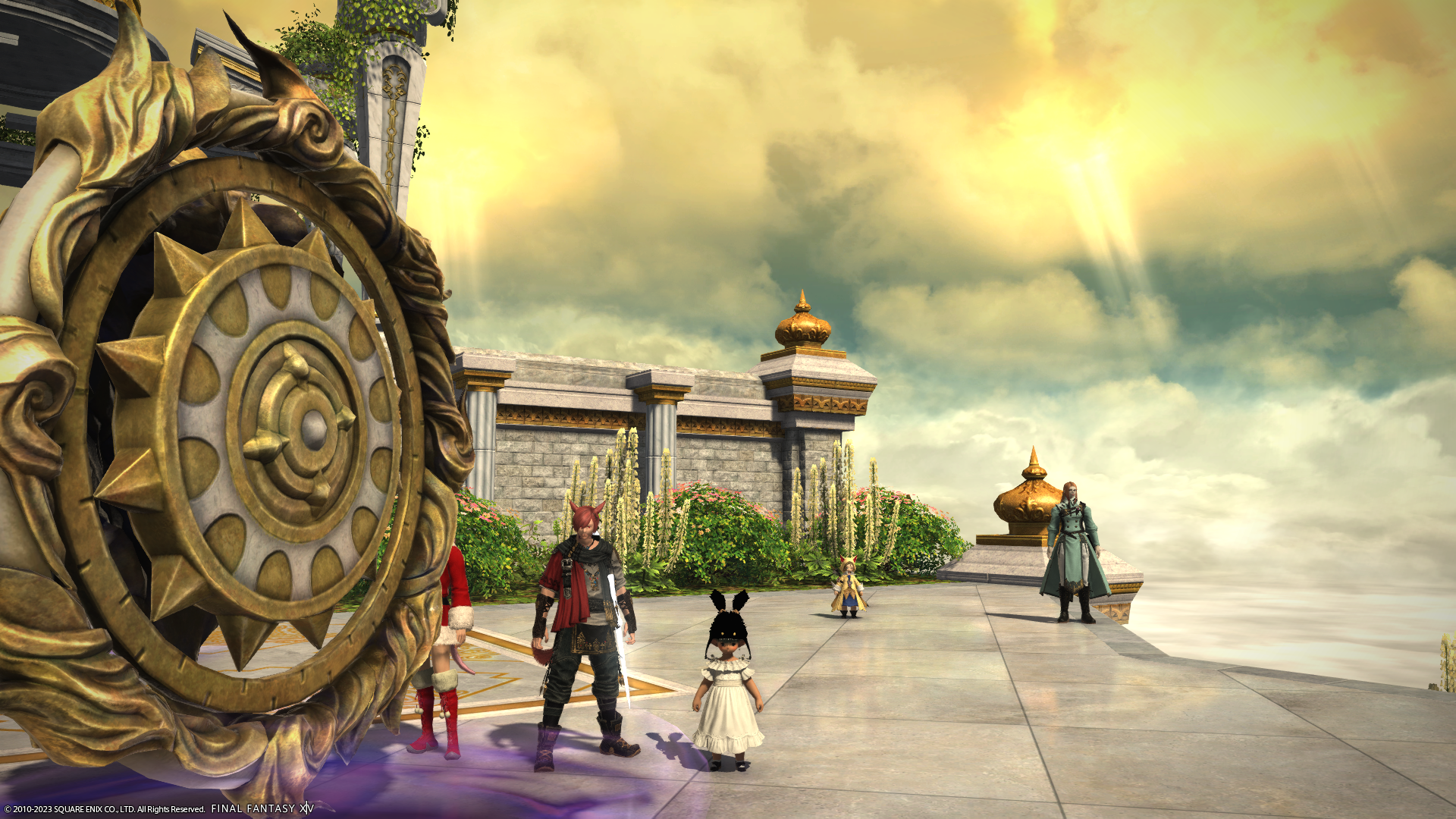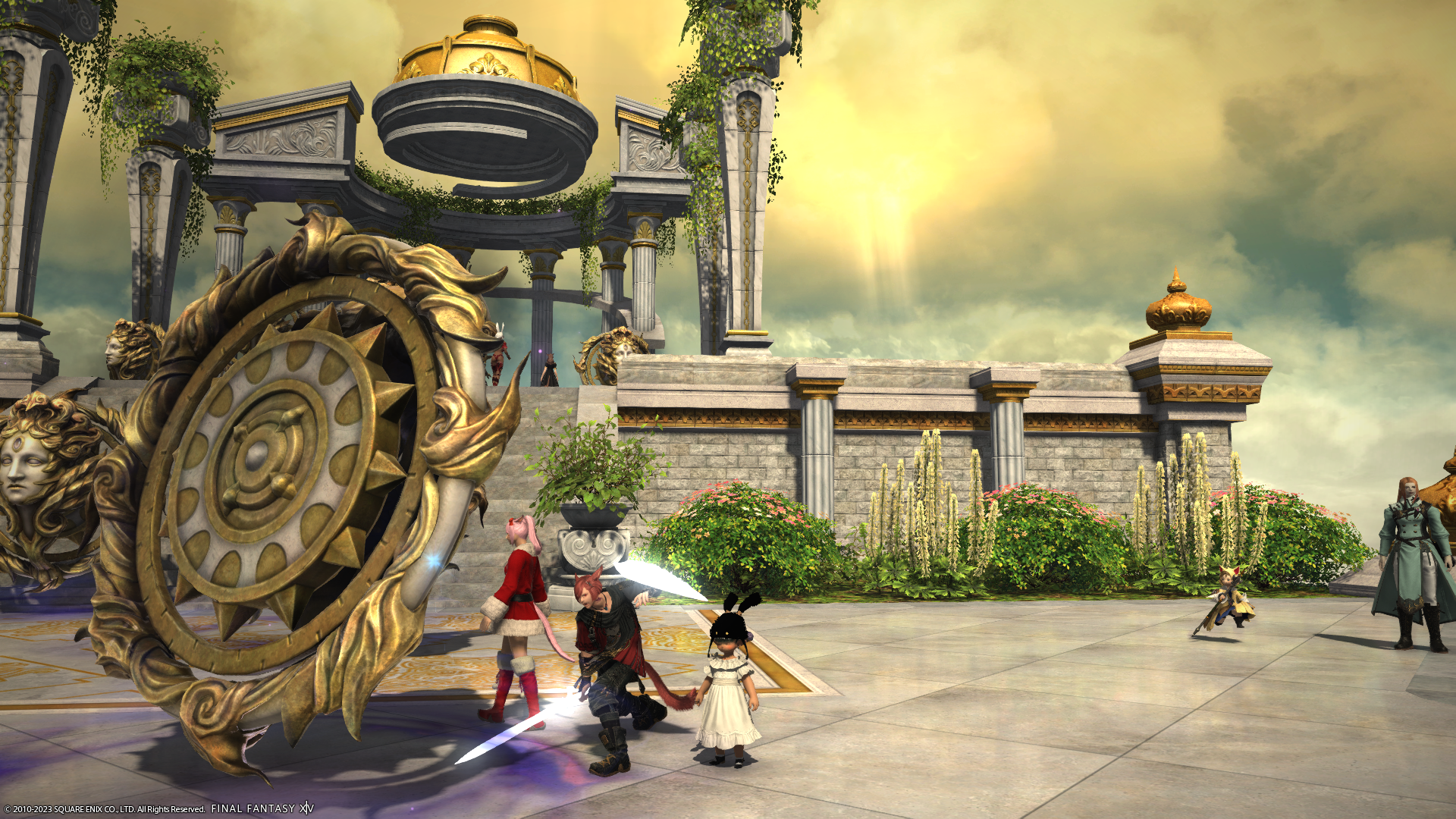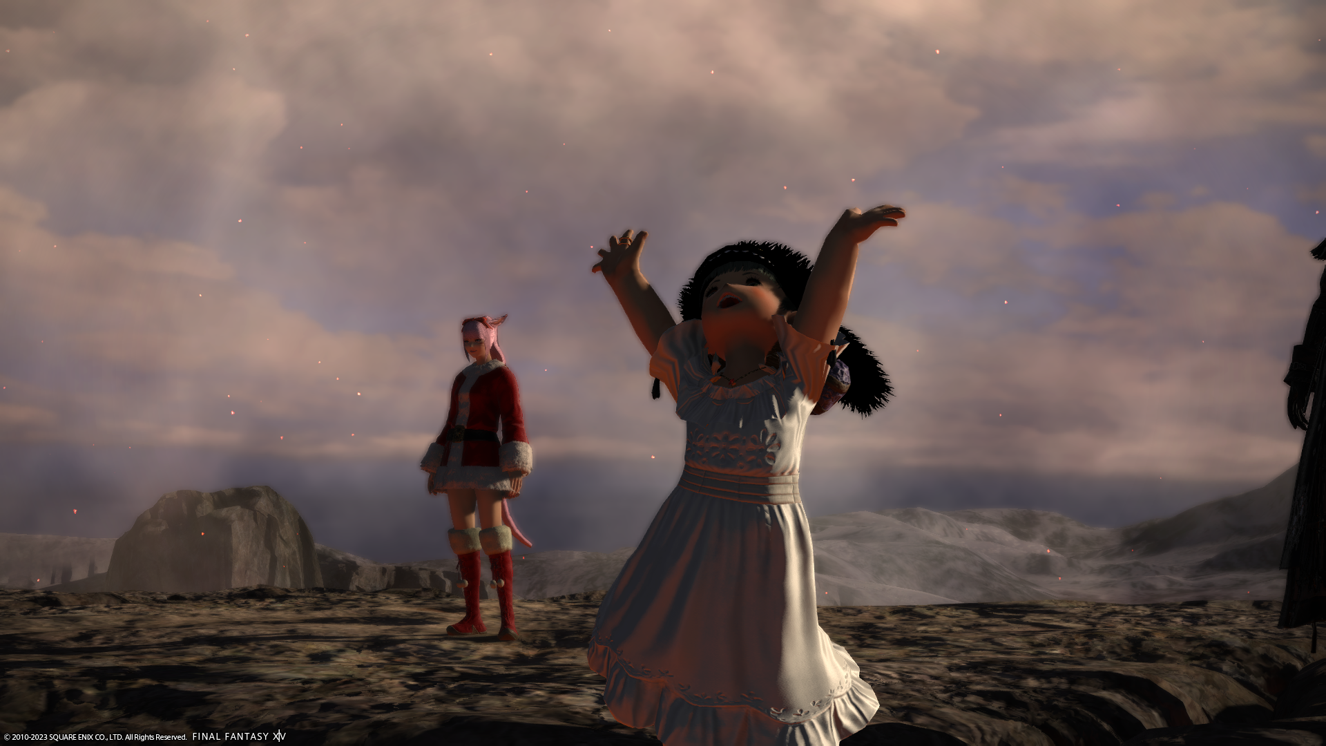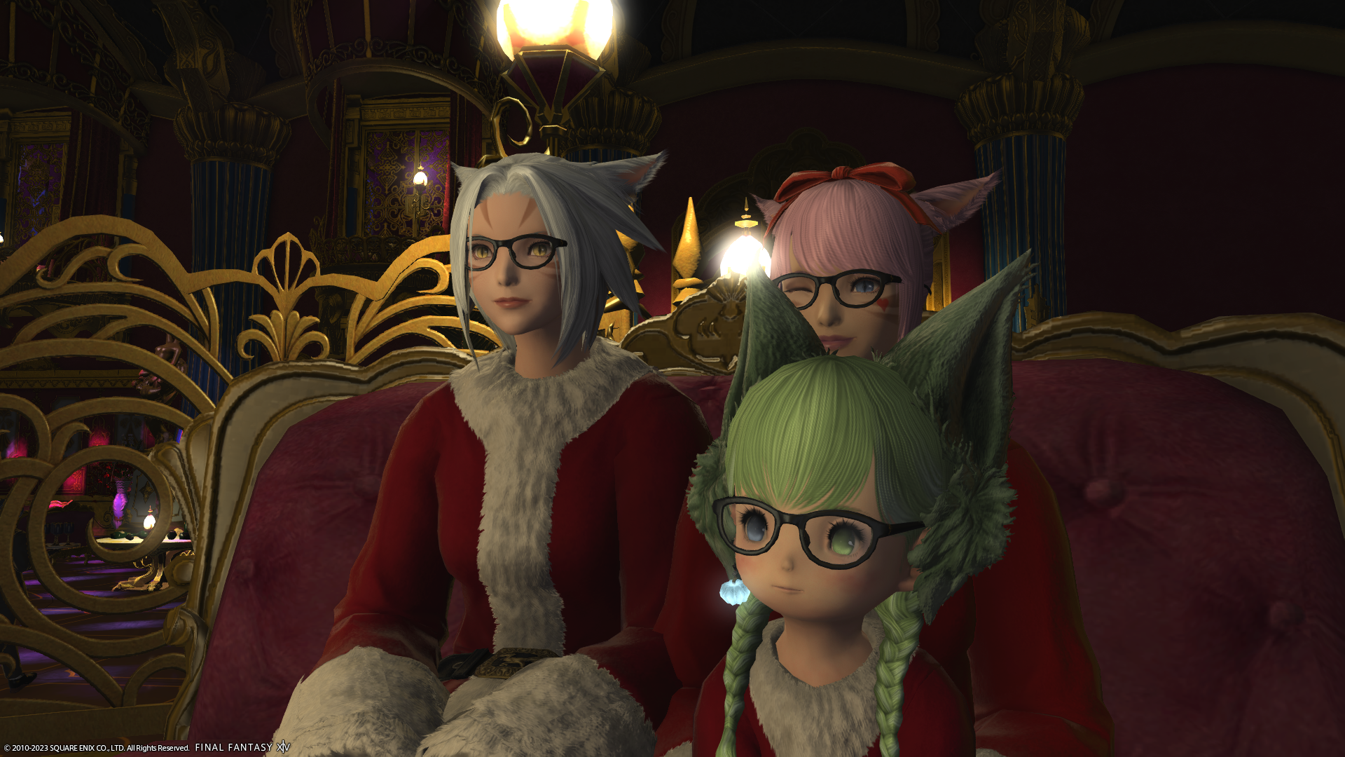 わたくしの倉庫ちゃんだけサンタ服でないのがさみしいショット。左端のミコッテさんがハッピージャンプしちゃうとぱんつが見えちゃうので、ジャンプする前を撮影。