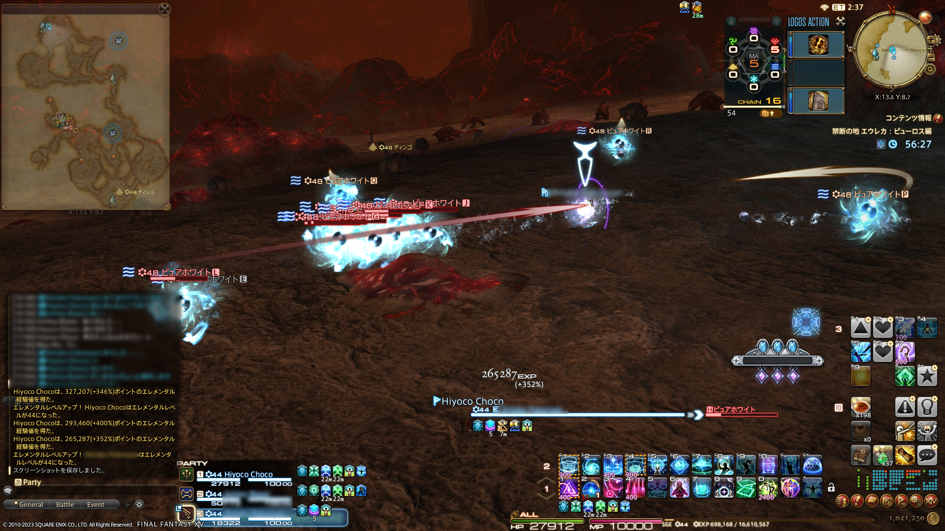 まずはひたすらレベル上げなのですが、少しレべルが上がったところで、フリーカンパニーメンバーさんが、ピュアホワイト上げをしてみようと思いますと。なにそれーと思ったら…