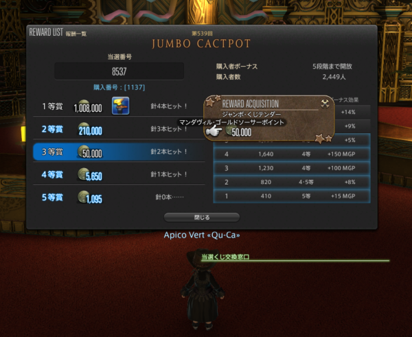 ジャンボ・くじテンダーは3等が出たよー!わーい。