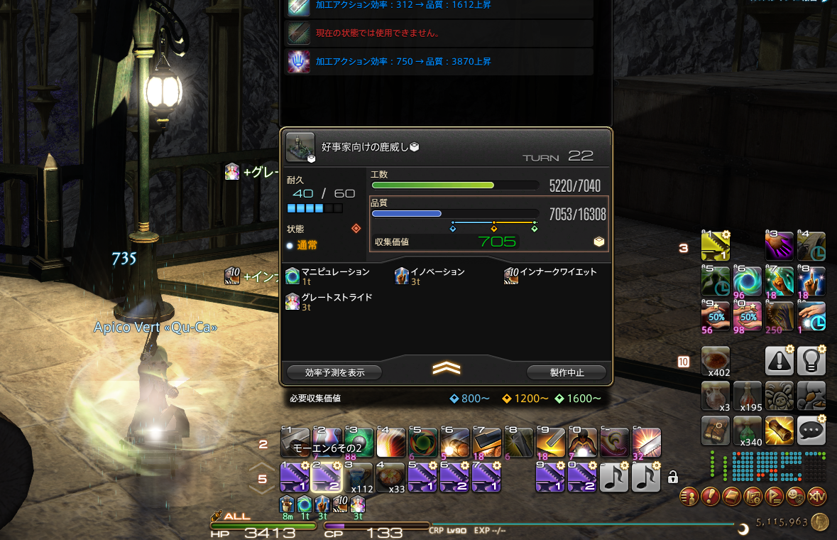 ただ、モーエンツールの5回目と6回目は特別なレシピなので、通常と違う状態が発生して、消費するCPが半分なんてことがあるのですよね。なので、薬品が切れていても助かった~!ということがあったりもしますけど。