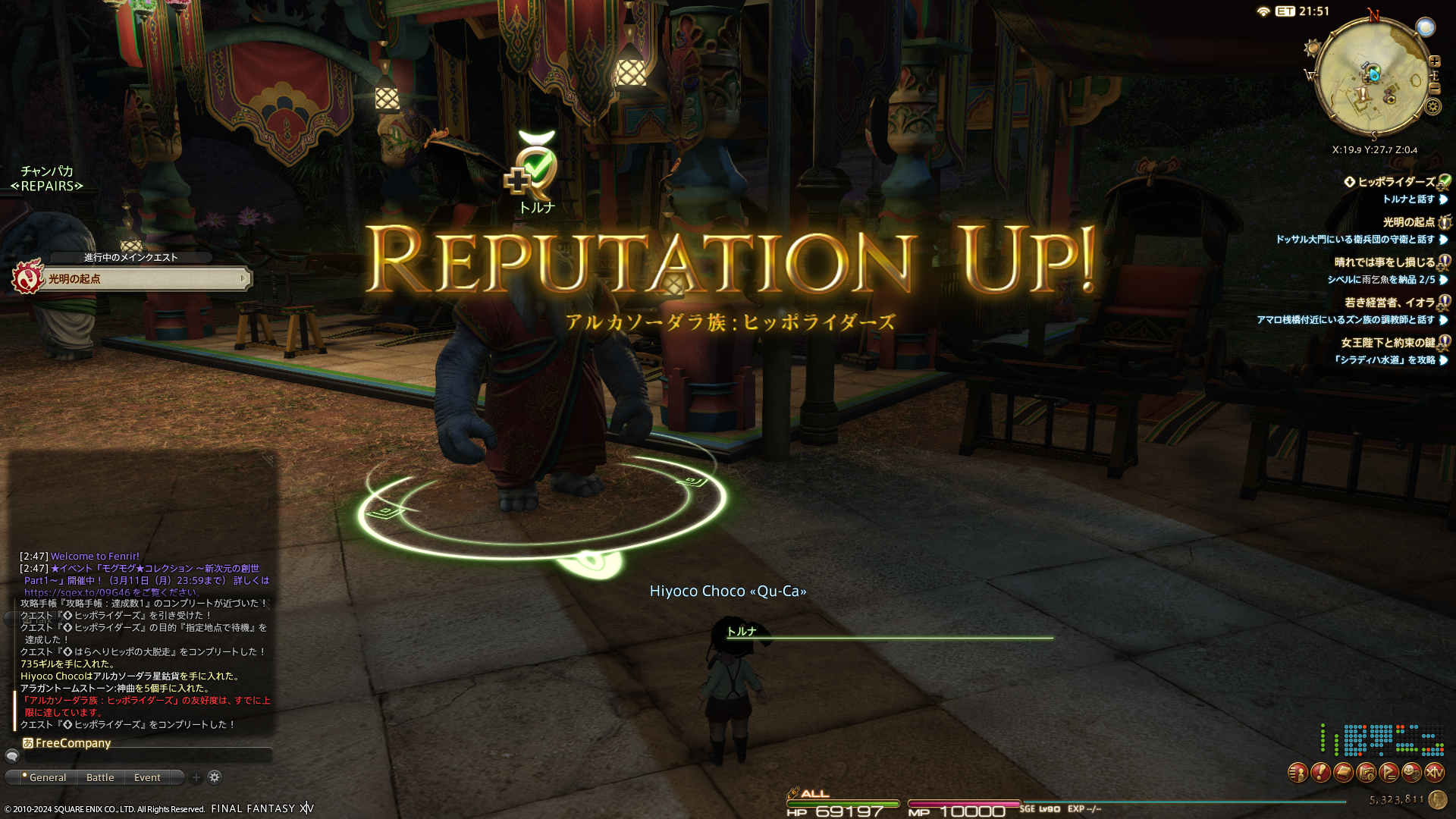浮気モード 投稿日時: 2024年2月21日 投稿者: zuizui 返信 本日のアライアンスレイドルーレットは… 闇の世界でした。 最近他のゲームをしているので、じゃっかんFF14がおろそかになっていたりします…でも日課のアライアンスレイドルーレットはいかねば! 倉庫ちゃん、ついにアルカソーダラ族の友好部族クエストの友好度が最大になりました! これで、暁月エリアの友好部族クエスト全部が友好度最大になったので、レポリットダンスをもらえるクエストが発生しているはず! 早く覚えたい気持ちはあるけど、クエストはあちこち移動で大変だった気がするので、まあのんびりと行きます。