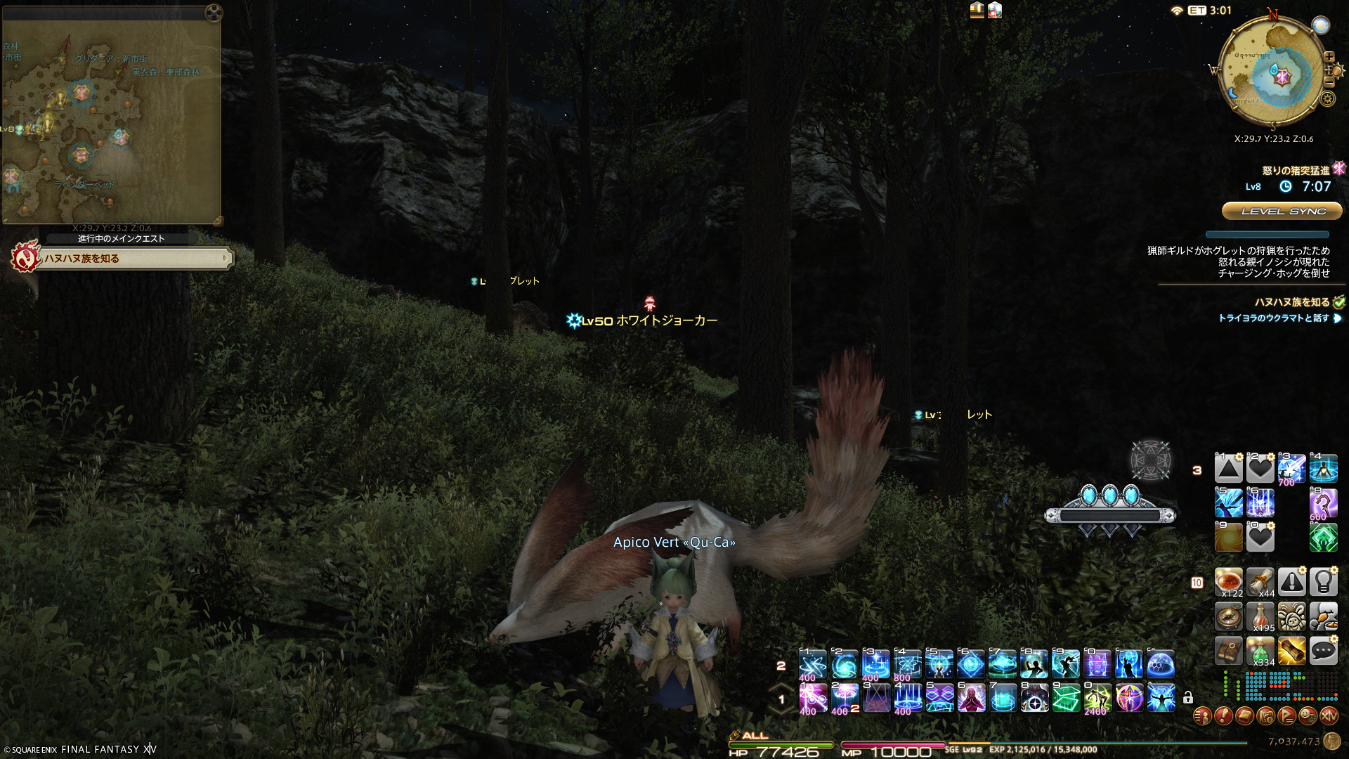 このあたりから、ことあるごとにクルルさんと撮影をするようになったので、メインクエストがなかなか進まなくなりました。イベントシーンはあとで見ることができても、進行中フィールドにいるNPCはその時だけですからねーっ。夜は撮影しても暗いので、わざわざ朝まで待ったりしてたらほんと進まない…。