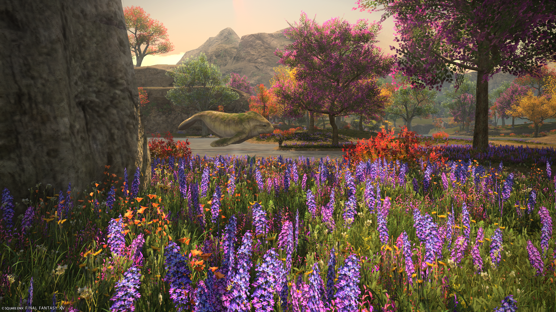 グラフィックアップデートのおかげで植物がきれいにはなったとは思うんですが、ここで見えてる紫っぽいお花がムービーシーンではぺっらぺっらなのが気になりました。きれいだし雰囲気いい感じなんですけど、よく見るとぺらぺらなの…。そこだけ2Dというか…。設定で変わったりするのかなぁ。