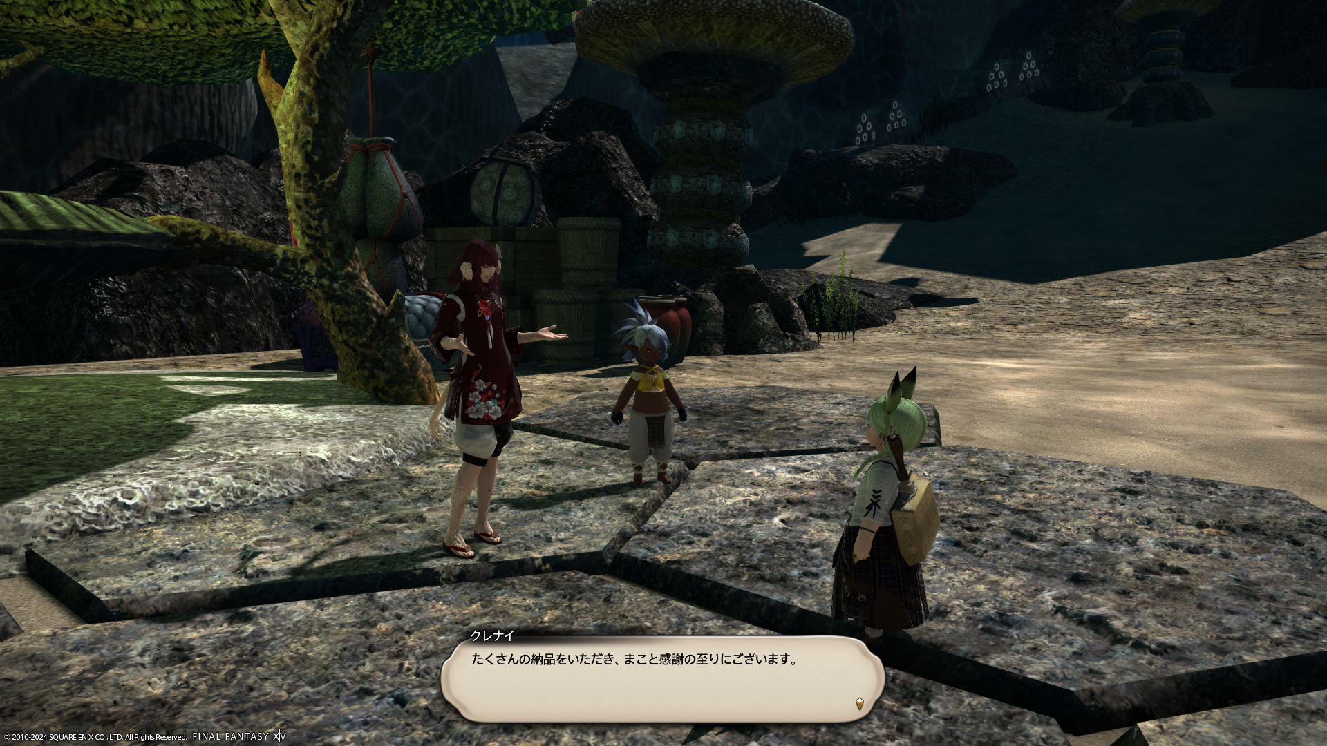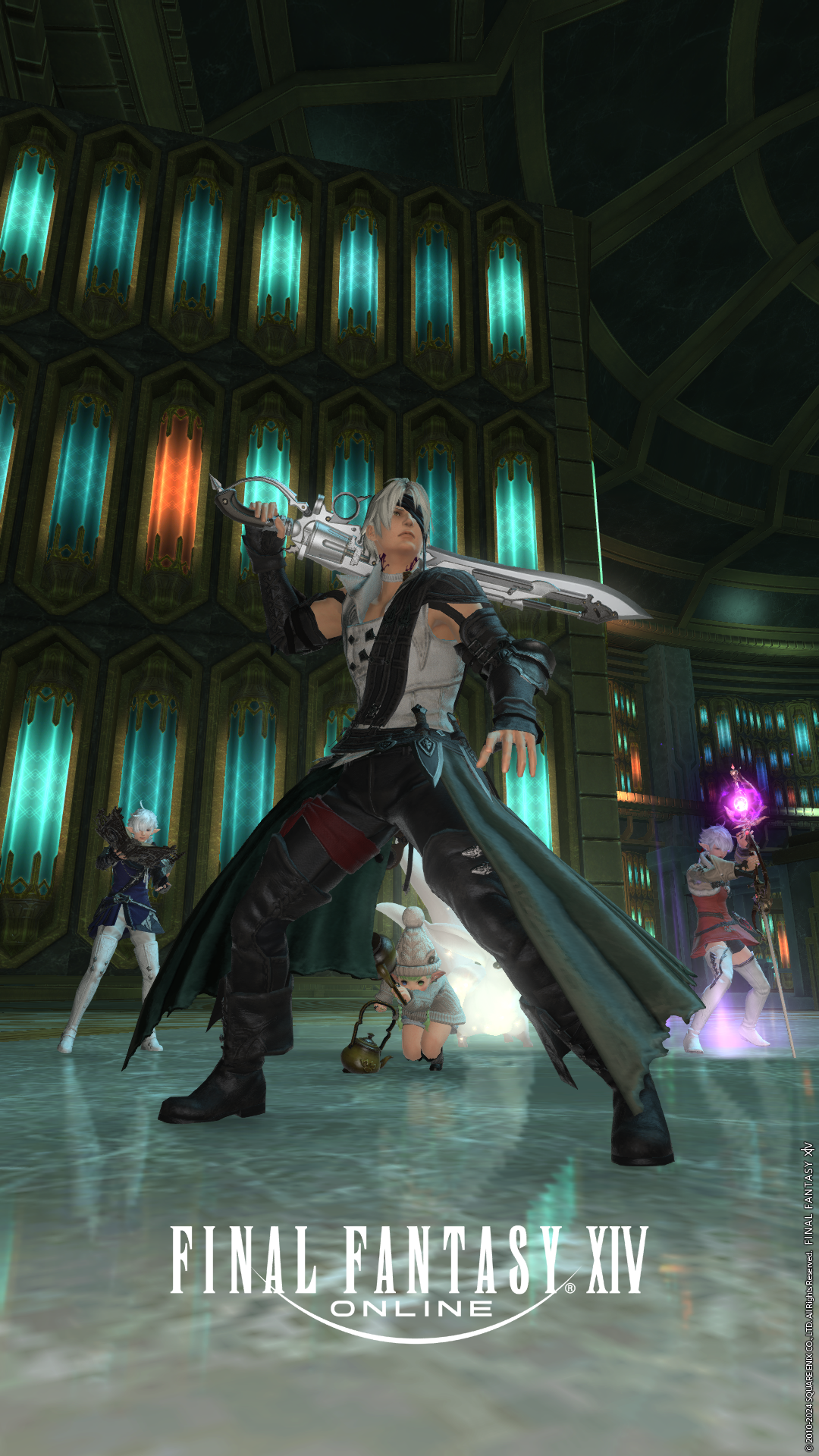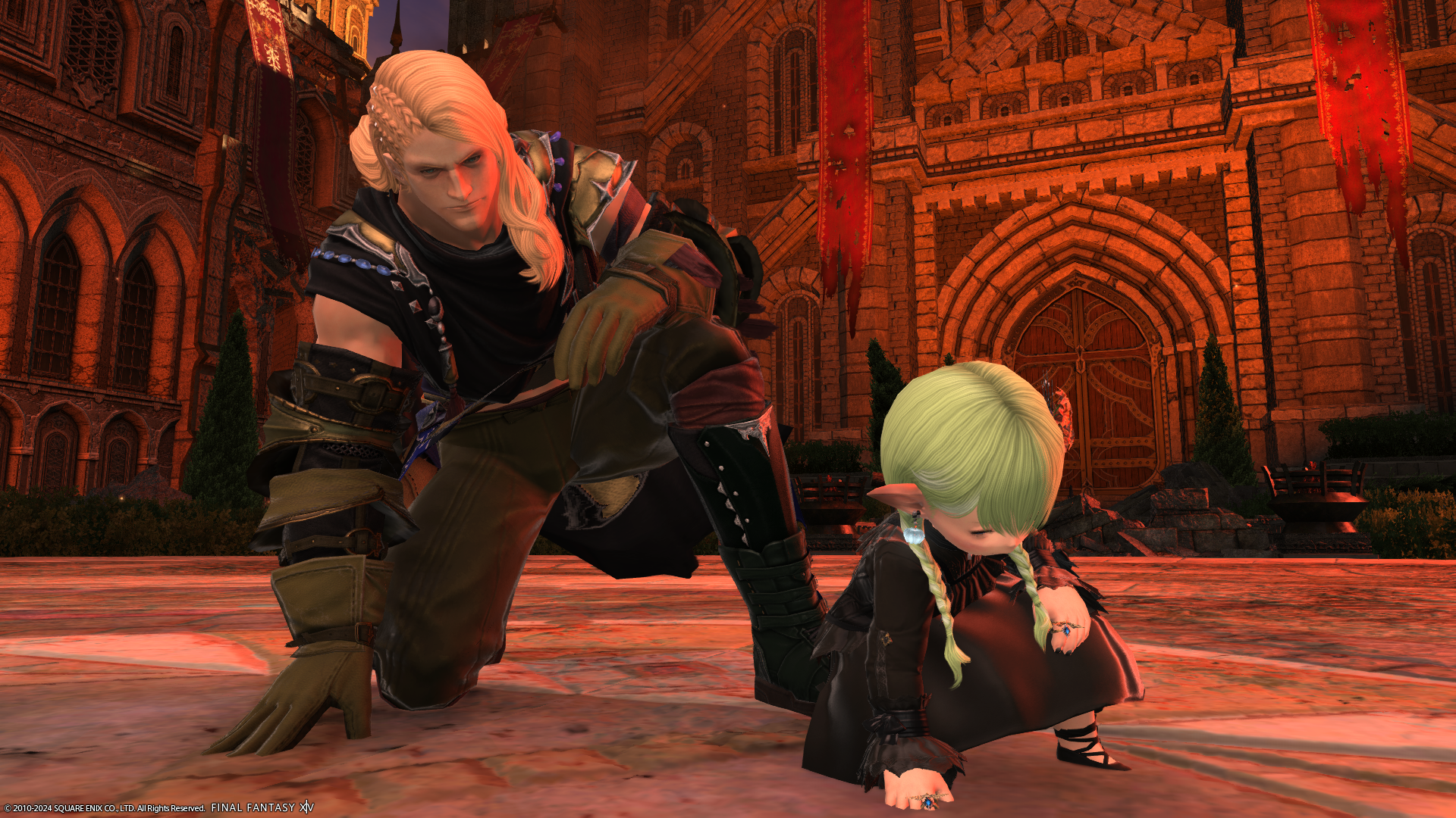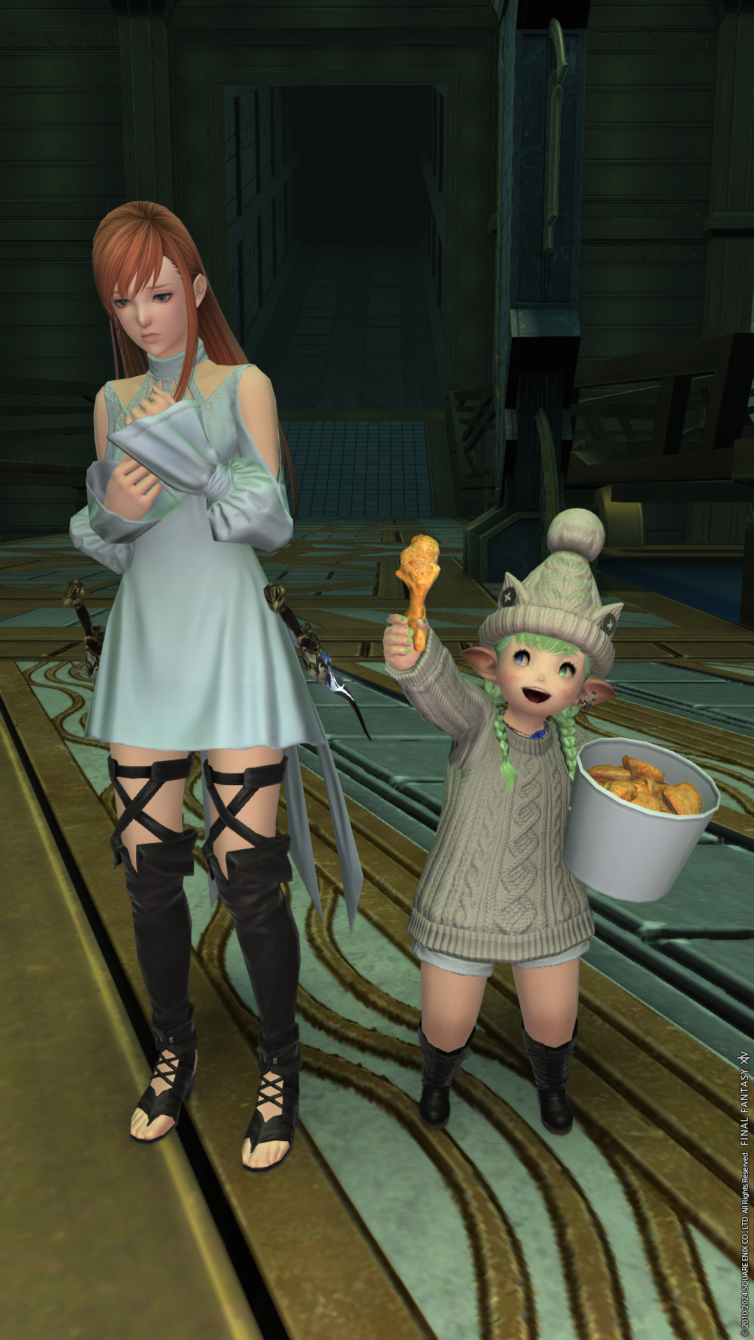 タンク役のNPCがPCに一歩前に位置取りをするので、全員の顔が見えるように撮影するのが大変難しく、わたくしサンクレッドさんの脚の間からこんにちは!