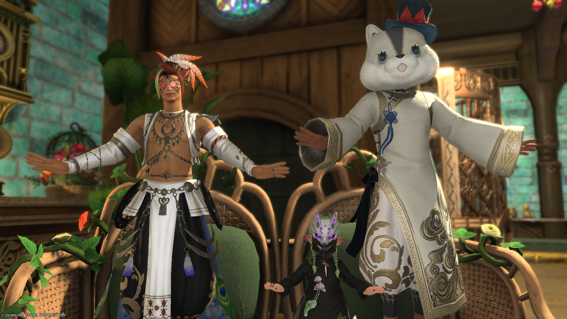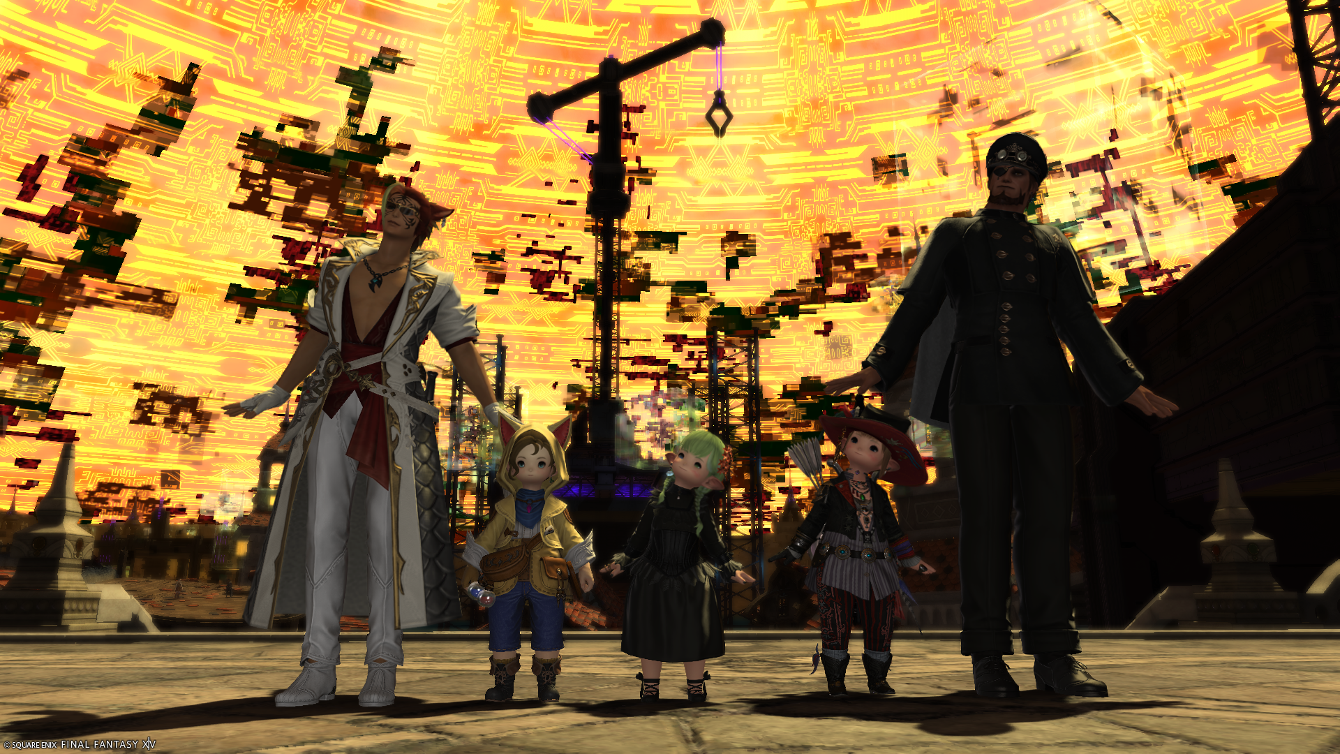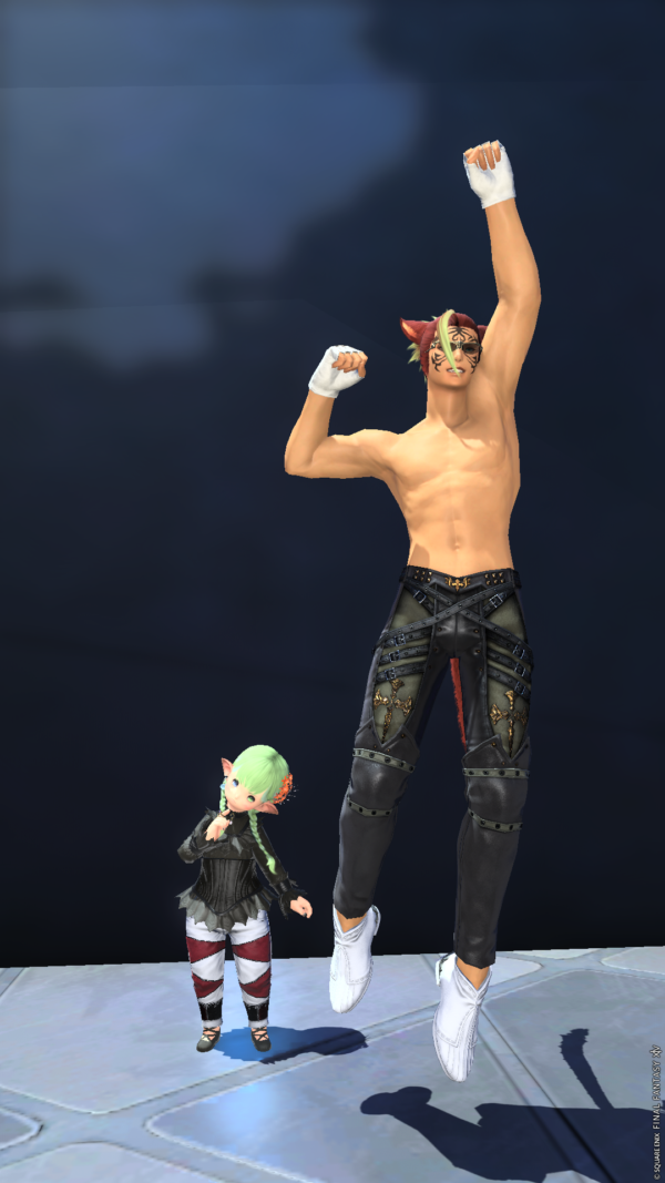 なかなか個性的なデザインの脚装備でした。一緒に映っているフリーカンパニーメンバーさんも、交換した装備らしいです。