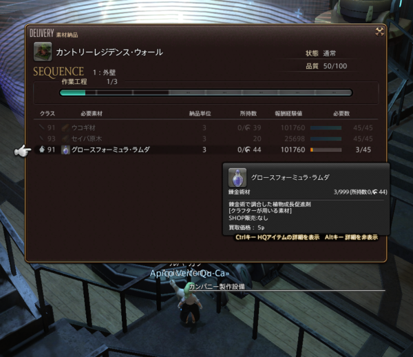 錬金術で要求される納品物は、材料にモンスタードロップの素材を使うので納品物の材料集めに結構時間がかかります。木材とか金属材はだいたいギャザラーで素材を取ってこられるのですけど、モンスタードロップ素材は基本リテイナーに頼ることになるので…。