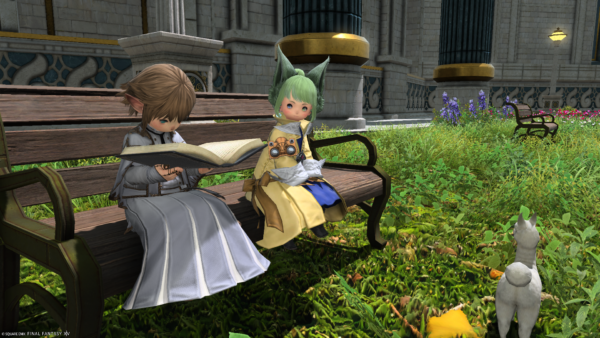 ウルティマ・トゥーレからラビリンソス経由で徒歩でオールド・シャーレアンに来たので、いつも本を読んでるNPCさんとも撮影。