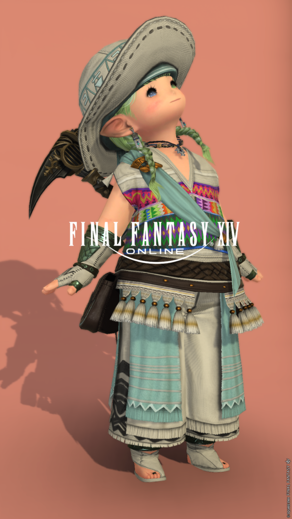 この装備、カラフルで結構かわいいですよね。ギャザラー装備は割とミラプリしちゃうけどこれはこのままで行こうかなぁ。前髪隠れちゃうのが気になるので、頭だけはミラプリしようかなと思ってます。