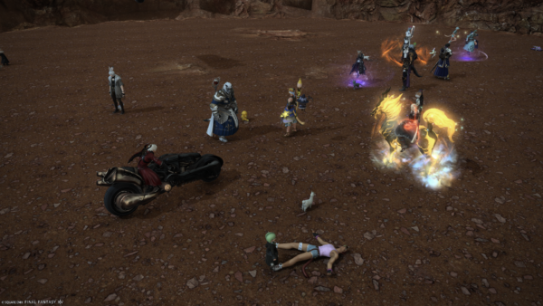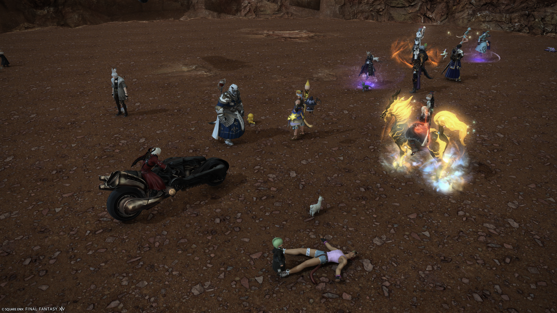 ちなみに倒れてるのが情報を提供してくださったメンバーさんですが、エモートで倒れているだけです…。今回重すぎてえっ?なんで!?っていう感じで転がってました。アップデート後なので人が多いですね。FF11のかつてのビシージほどでもないけど、ちょっと思い出すくらい重かった。