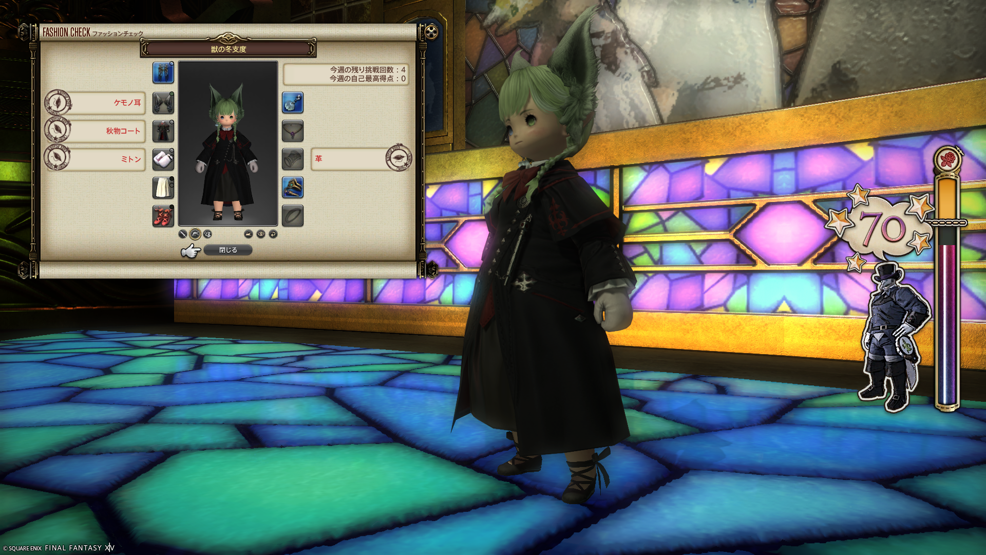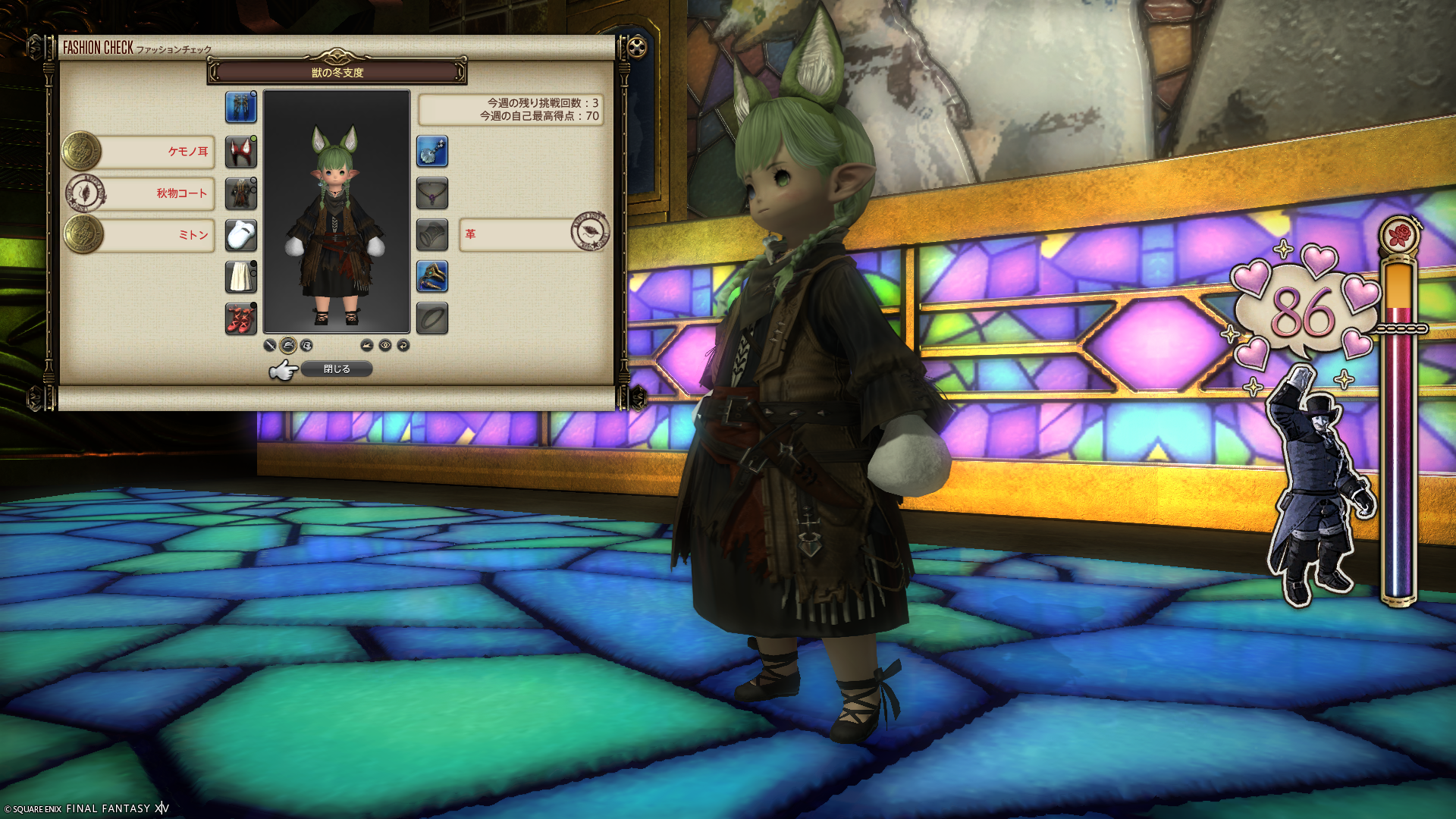 週末なのでファッションチェックをしておかなくっちゃ、頭がケモノ耳で手がミトンだったので、適当に装備してチェックしてみると…