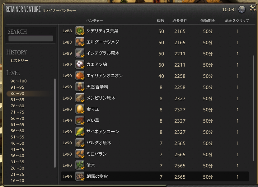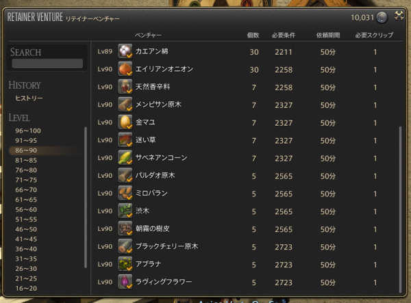 ただ、Lv91以降の通常素材の取得個数は、パクトメーカー装備だった園芸リテイナーは20個で、それよりILが低いカエアンビロード装備だった採掘のリテイナーは15個なので、ILなりステータスなりなにかが取得個数には影響してそうです。